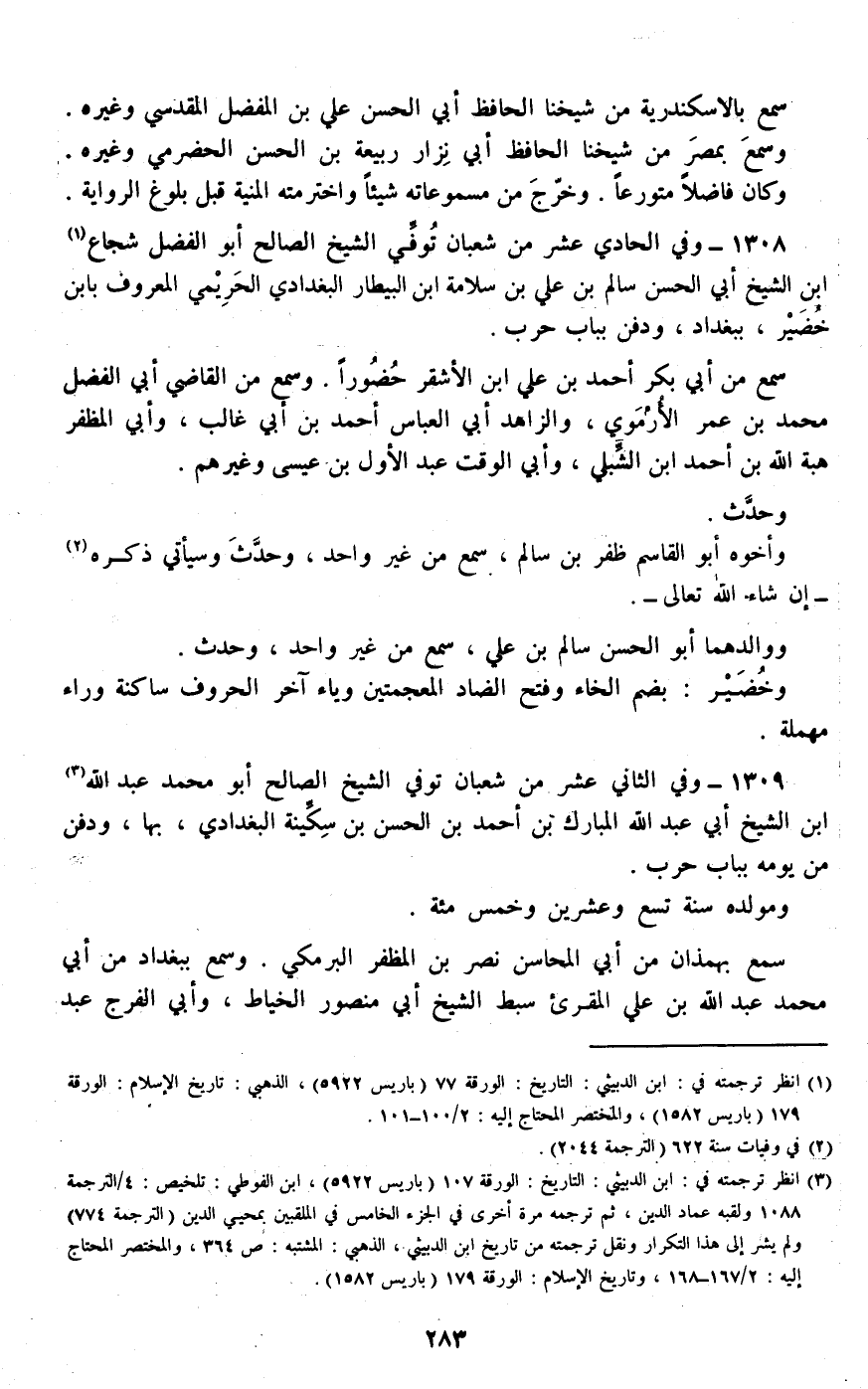 1308 - وفي الحادي عشر من شعبان توفي الشيخ الصالح أبو الفضل شجاع ابن الشيخ أبي الحسن سالم بن علي بن سلامة ابن البيطار البغدادي الحريمي المعروف بابن خضير، ببغداد، ودفن بباب حرب.