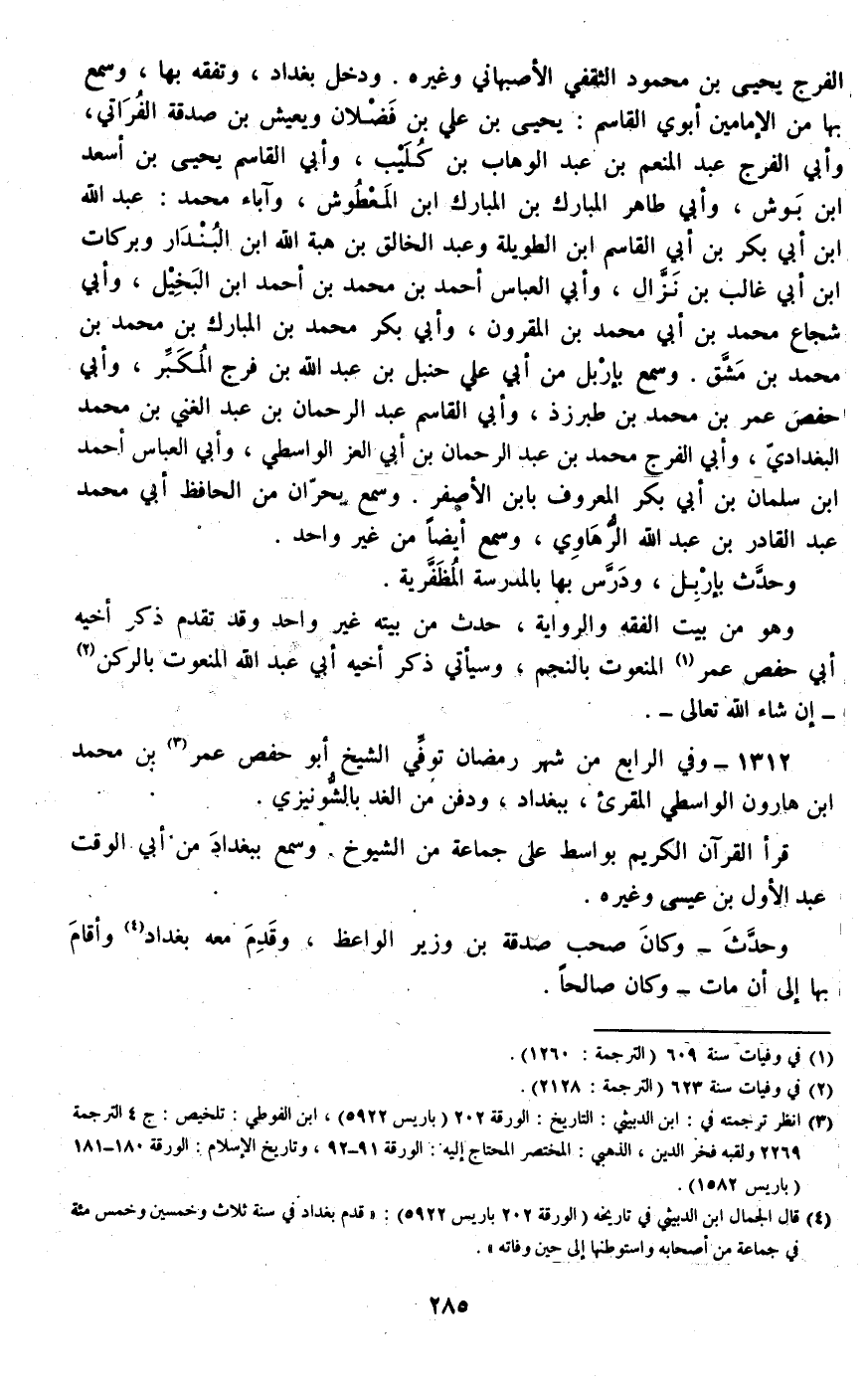 1312 - وفي الرابع من شهر رمضان توفي الشيخ أبو حفص عمر بن محمد بن هارون الواسطي المقرئ، ببغداد، ودفن من الغد بالشونيزي.