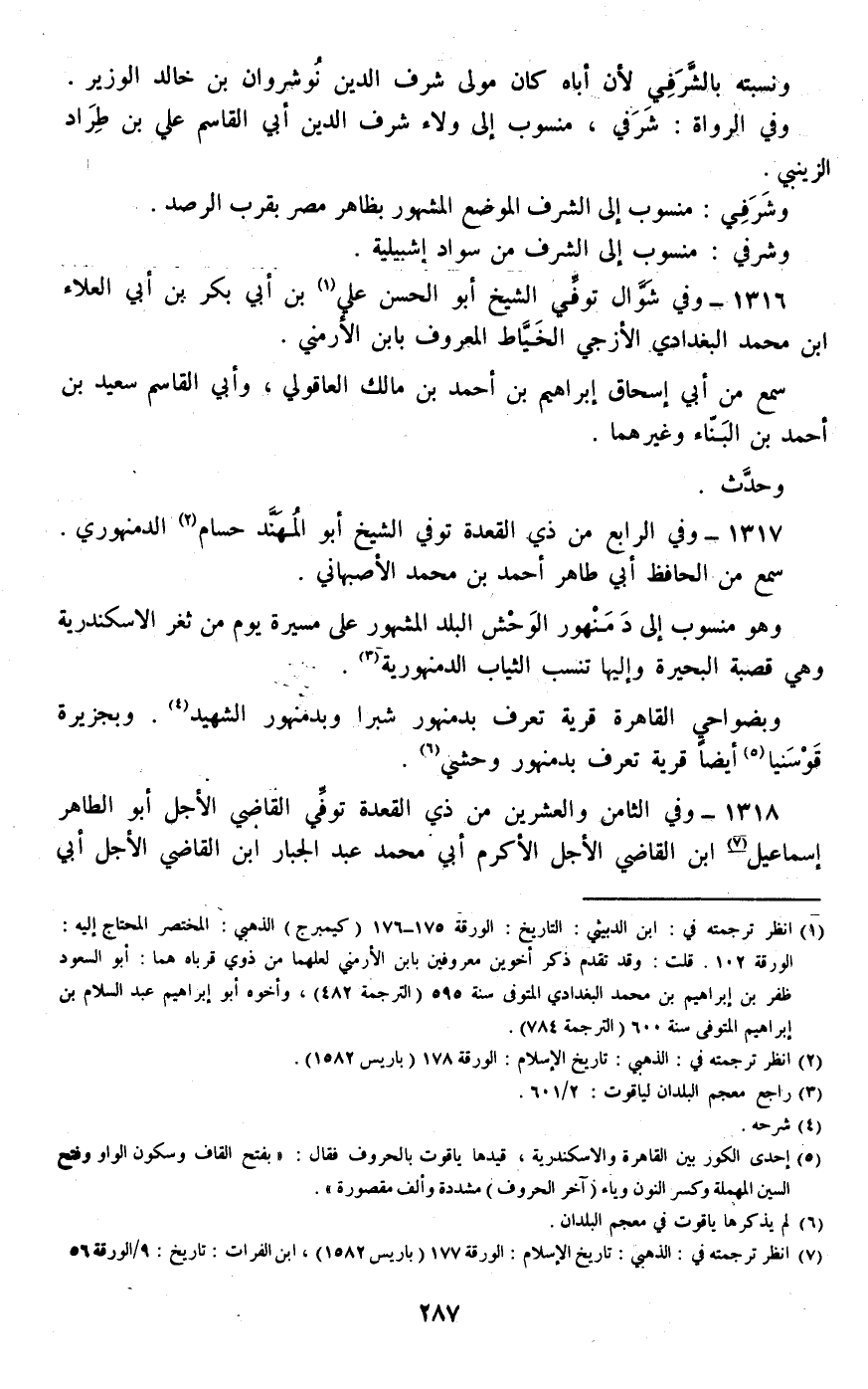 1316 - وفي شوال توفي الشيخ أبو الحسن علي بن أبي بكر بن أبي العلاء بن محمد البغدادي الأزجي الخياط المعروف بابن الأرمني.