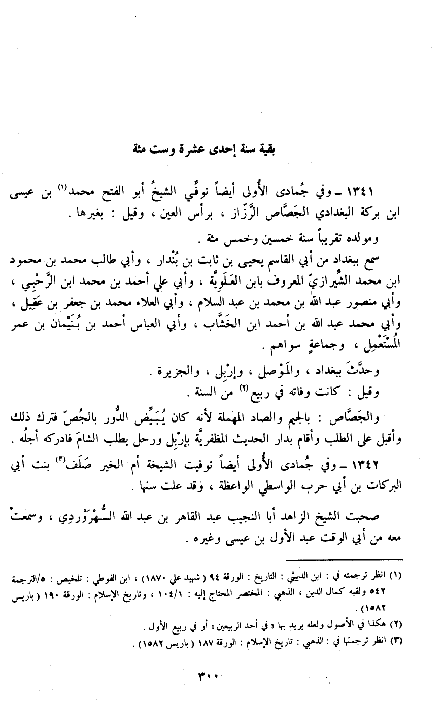 1341 - وفي جمادى الأولى أيضا توفي الشيخ أبو الفتح محمد بن عيسى بن بركة البغدادي الجصاص الرزاز، برأس العين، وقيل: بغيرها.