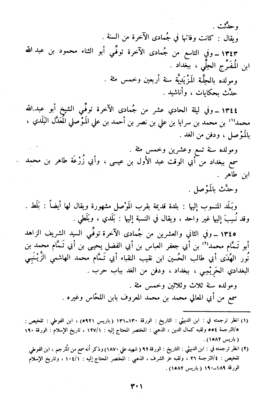 1345 - وفي الثاني والعشرين من جمادى الآخرة توفي السيد الشريف الزاهد أبو تمام محمد بن أبي جعفر العباس بن أبي الفضل يحيى بن أبي تمام محمد بن نور الهدى أبي طالب الحسين ابن نقيب النقباء أبي تمام محمد الهاشمي الزينبي البغدادي الحريمي، ببغداد، ودفن من الغد بباب حرب.