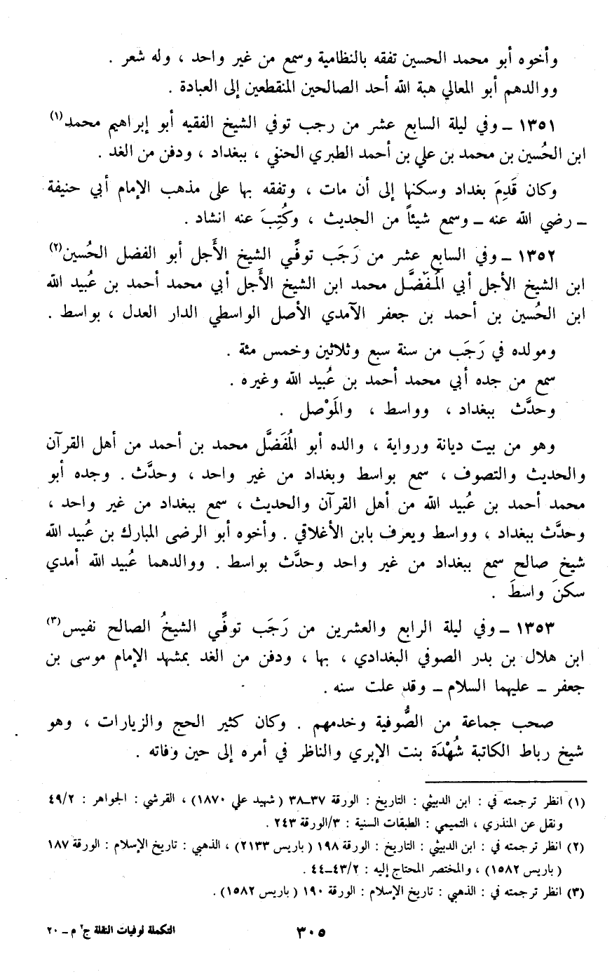 1353 - وفي ليلة الرابع والعشرين من رجب توفي الشيخ الصالح نفيس بن هلال بن بدر الصوفي البغدادي، بها، ودفن من الغد بمشهد الإمام موسى بن جعفر - عليهما السلام- وقد علت سنه.