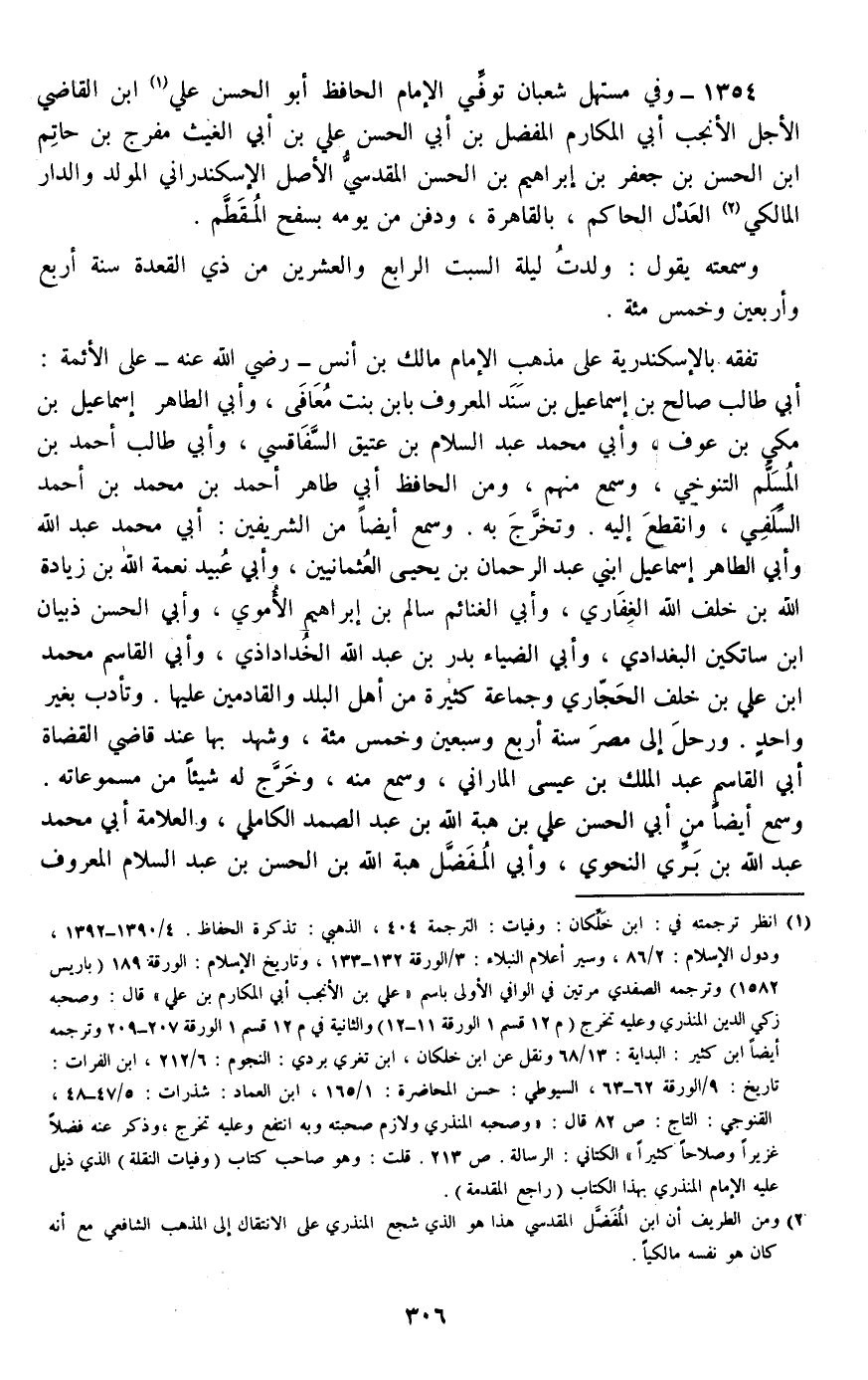 1354 - وفي مستهل شعبان توفي الإمام الحافظ أبو الحسن علي ابن القاضي الأجل الأنجب أبي المكارم المفضل بن أبي الحسن علي بن أبي الغيث مفرج بن حاتم بن الحسن بن جعفر بن إبراهيم بن الحسن المقدسي الأصل الإسكندراني المولد والدار المالكي العدل الحاكم، بالقاهرة، ودفن من يومه بسفح المقطم.