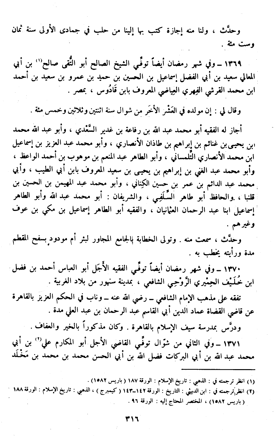 1370 - وفي شهر رمضان أيضا توفي الفقيه الأجل أبو العباس أحمد بن فضل بن خليف الحميري الروحي الشافعي، بمدينة سنهور من بلاد الغربية.
