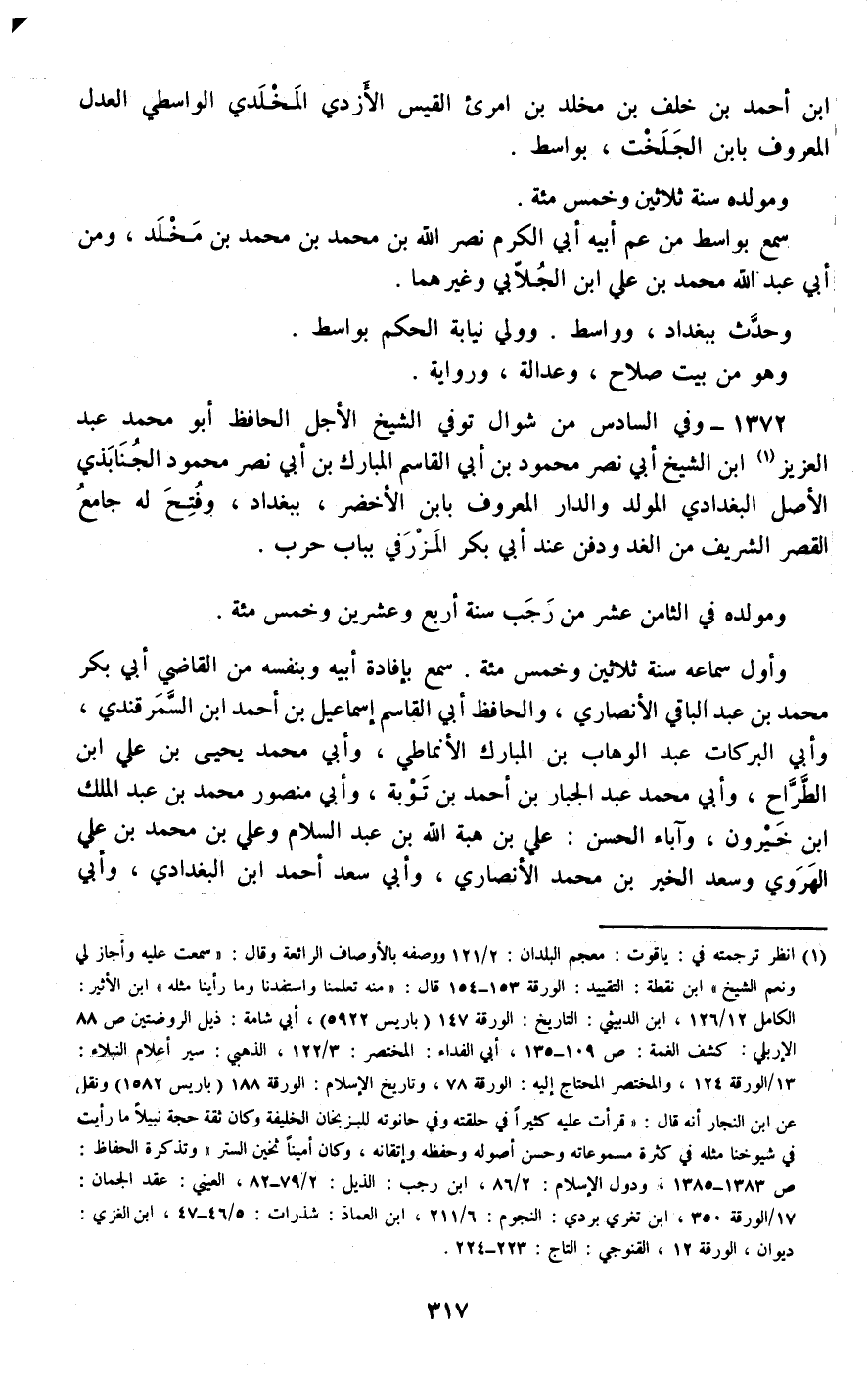 1372 - وفي السادس من شوال توفي الشيخ الأجل الحافظ أبو محمد عبد العزيز ابن الشيخ أبي نصر محمود بن أبي القاسم المبارك بن أبي نصر محمود الجنابذي الأصل البغدادي المولد والدار المعروف بابن الأخضر، ببغداد، وفتح له جامع القصر الشريف من الغد ودفن عند أبي بكر المزرفي بباب حرب.