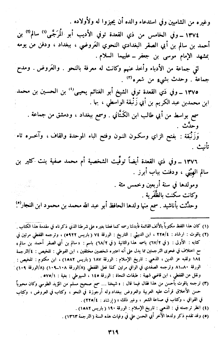 1374 - وفي الخامس من ذي القعدة توفي الأديب أبو المرجى سالم بن أحمد بن سالم بن أبي الصقر البغدادي النحوي العروضي، ببغداد، ودفن من يومه بمشهد الإمام موسى بن جعفر -عليهما السلام-.