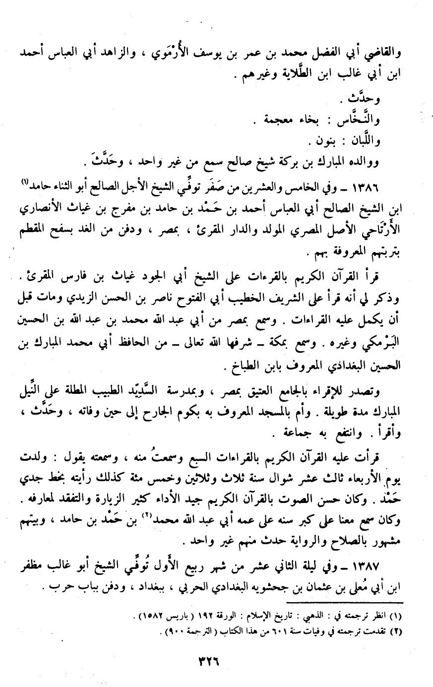 1386 - وفي الخامس والعشرين من صفر توفي الشيخ الأجل الصالح أبو الثناء حامد ابن الشيخ الصالح أبي العباس أحمد بن حمد بن حامد بن مفرج بن غياث الأنصاري الأرتاحي الأصل المصري المولد والدار المقرئ، بمصر، ودفن من الغد بسفح المقطم بتربتهم المعروفة بهم.
