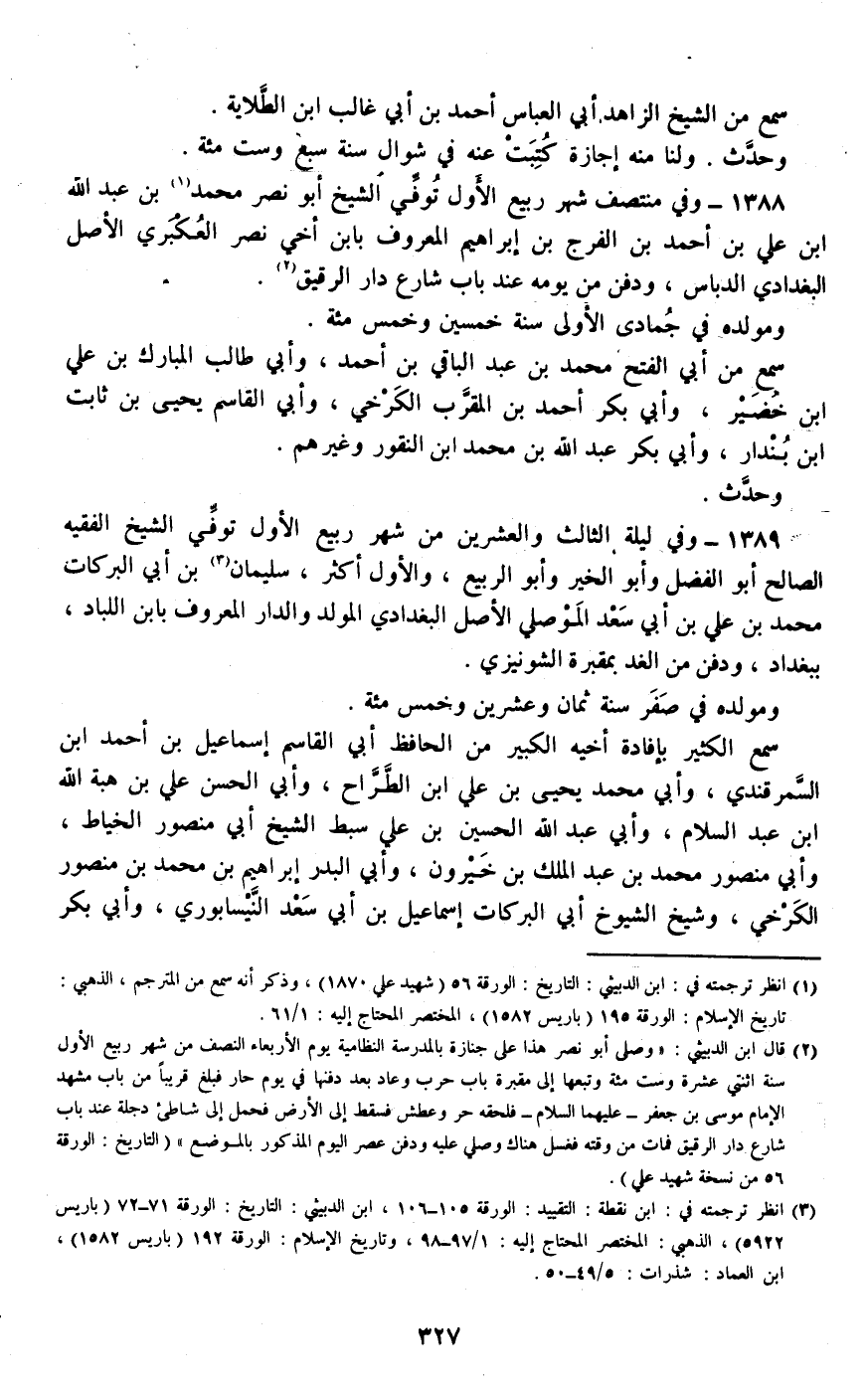 1388 - وفي منتصف شهر ربيع الأول توفي الشيخ أبو نصر محمد بن عبد الله بن علي بن أحمد بن الفرج بن إبراهيم المعروف بابن أخي نصر العكبري الأصل البغدادي الدباس، ودفن من يومه عند باب شارع دار الرقيق.