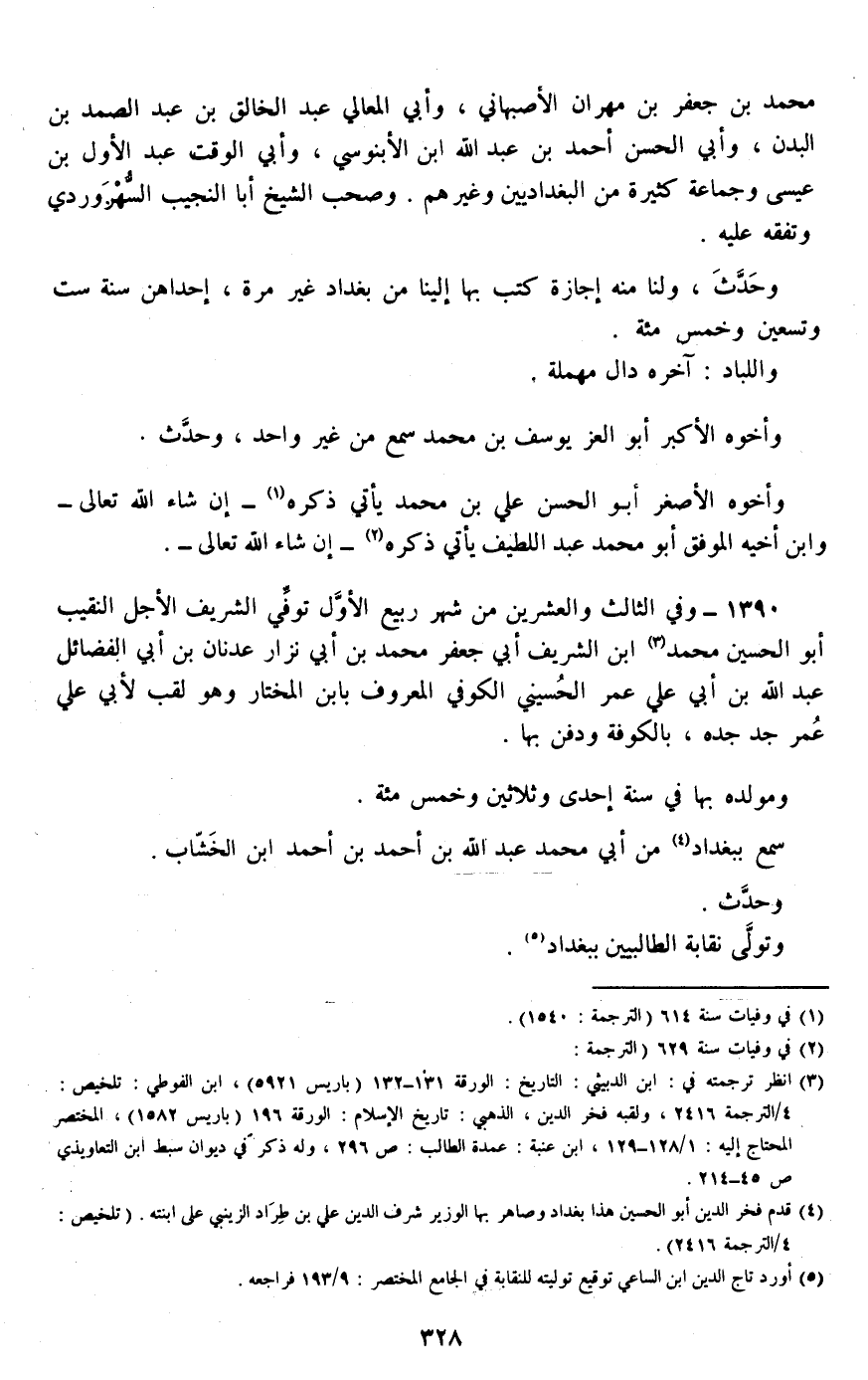 1390 - وفي الثالث والعشرين من شهر ربيع الأول توفي الشريف الأجل النقيب أبو الحسين محمد ابن الشريف أبي جعفر محمد بن أبي نزار عدنان بن أبي الفضائل عبد الله بن أبي علي عمر الحسيني الكوفي المعروف بابن المختار وهو لقب لأبي علي عمر جد جده، بالكوفة ودفن بها.