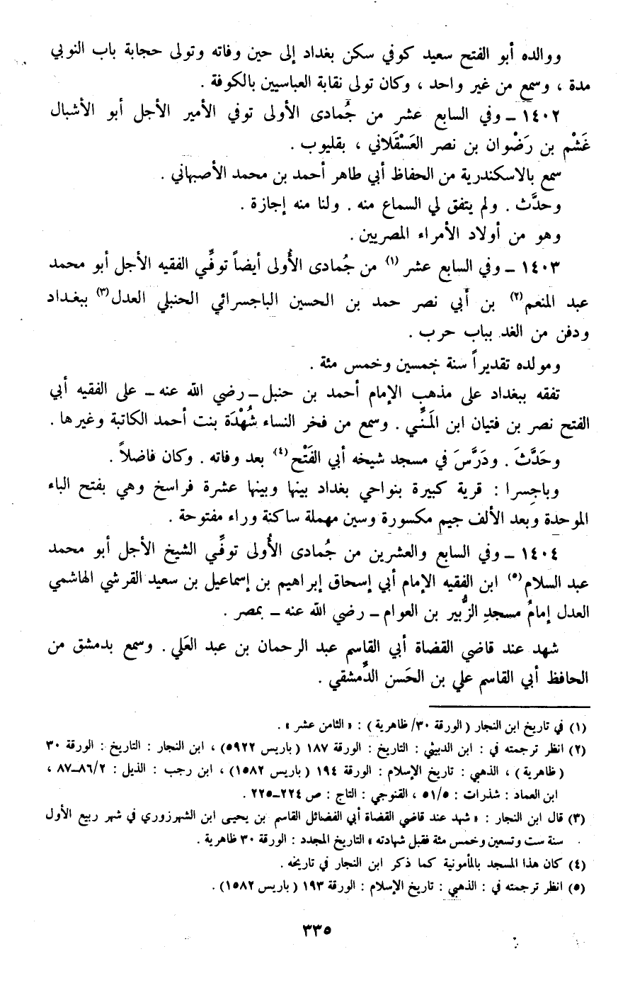 1403 - وفي السابع عشر من جمادى الأولى أيضا توفي الفقيه الأجل أبو محمد عبد المنعم بن أبي نصر حمد بن الحسين الباجسرائي الحنبلي العدل ببغداد ودفن من الغد بباب حرب.