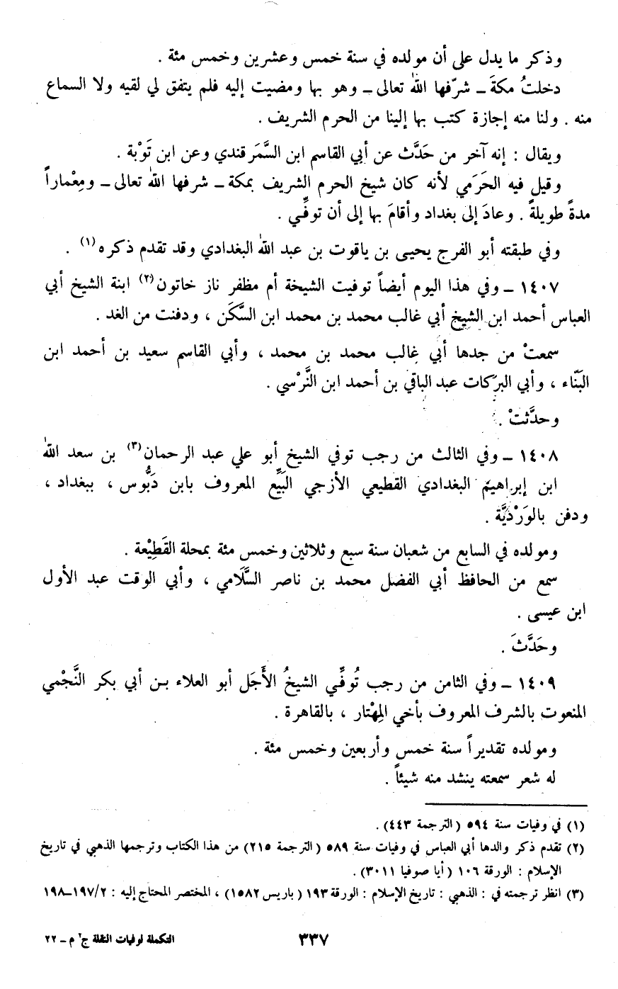 1408 - وفي الثالث من رجب توفي الشيخ أبو علي عبد الرحمان بن سعد الله بن إبراهيم البغدادي القطيعي الأزجي البيع المعروف بابن دبوس، ببغداد، ودفن بالوردية.