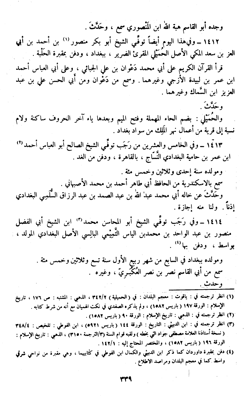 1414 - وفي رجب توفي الشيخ أبو المحاسن محمد ابن الشيخ أبي الفضل منصور بن عبد الواحد بن محمد بن الياس التميمي البالسي الأصل البغدادي المولد، بواسط، ودفن بها.