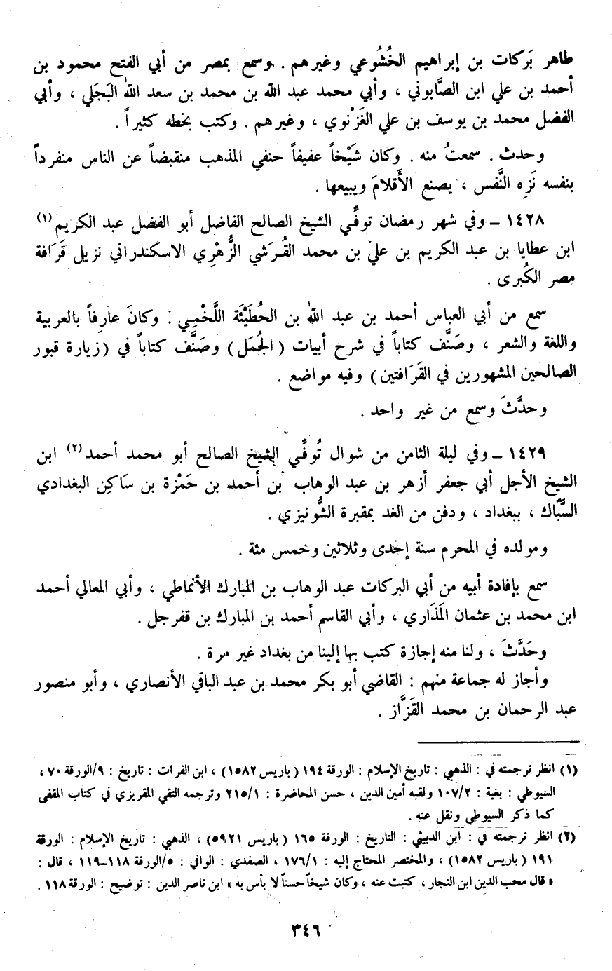 1429 - وفي ليلة الثامن من شوال توفي الشيخ الصالح أبو محمد أحمد ابن الشيخ الأجل أبي جعفر أزهر بن عبد الوهاب بن أحمد بن حمزة بن ساكن البغدادي السباك، ببغداد، ودفن من الغد بمقبرة الشونيزي.