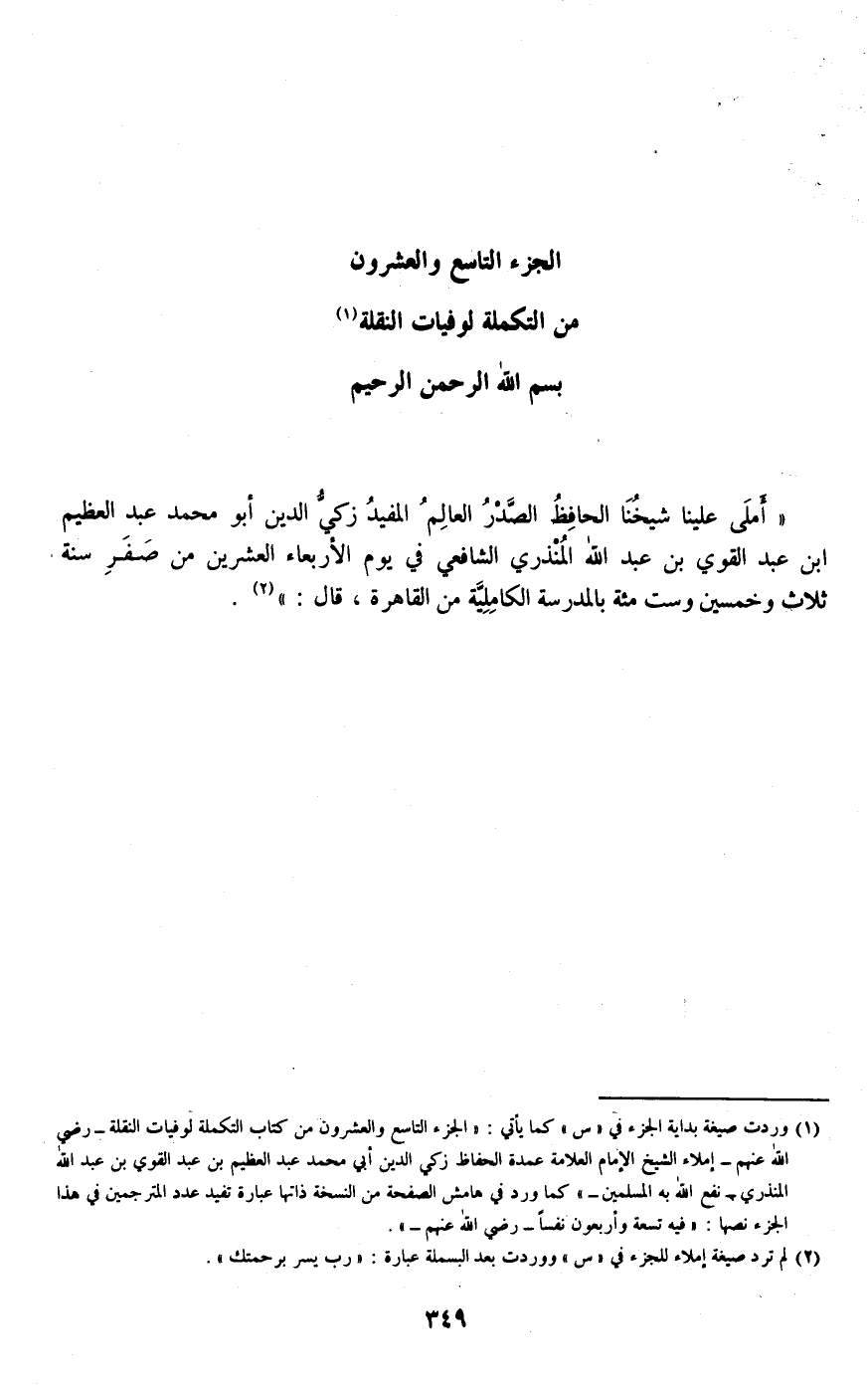 «أملى علينا شيخنا الحافظ الصدر العالم المفيد زكي الدين أبو محمد عبد العظيم بن عبد القوي بن عبد الله المنذري الشافعي في يوم الأربعاء العشرين من صفر سنة ثلاث وخمسين وست مئة بالمدرسة الكاملية من القاهرة، قال:»