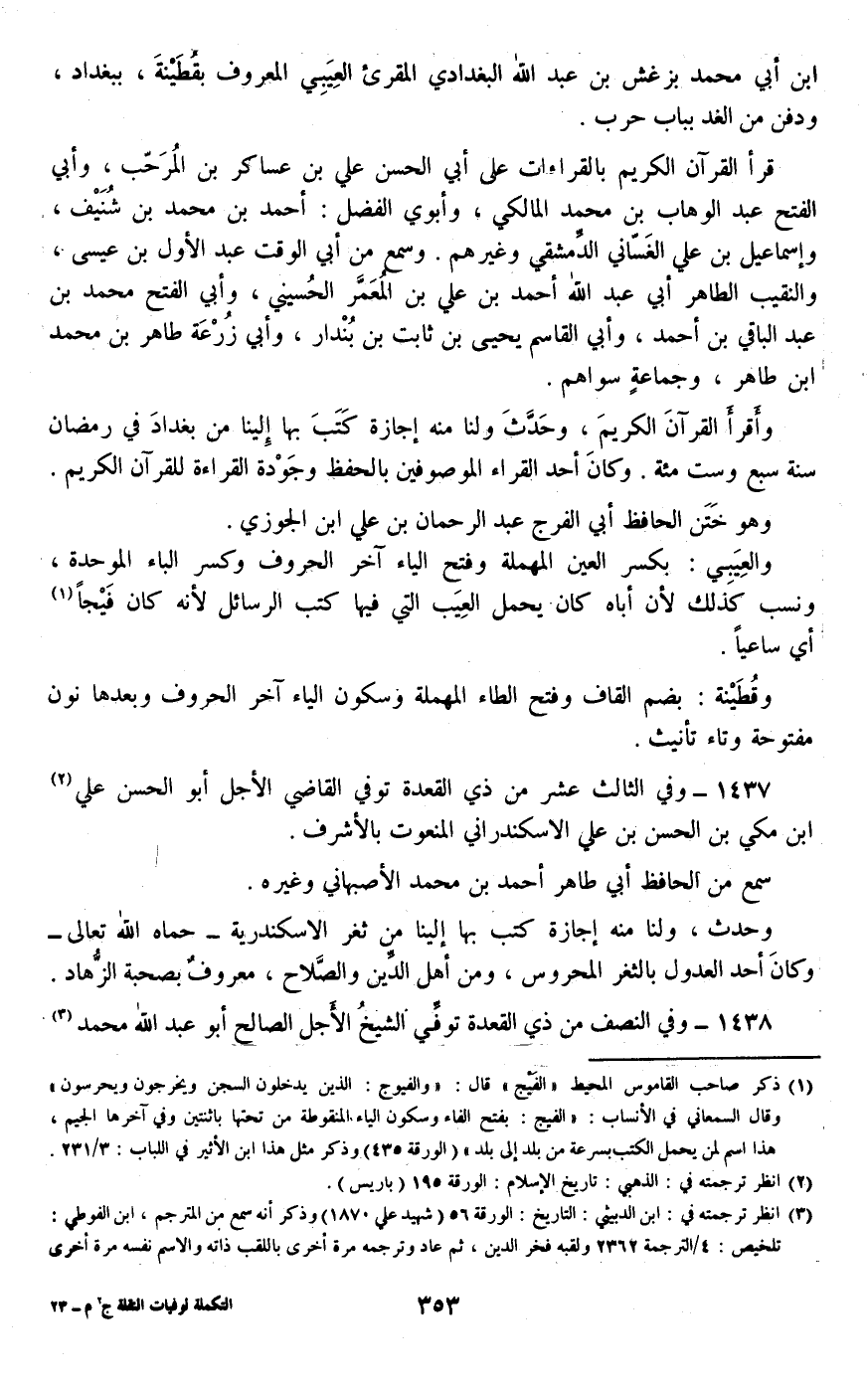 1438 - وفي النصف من ذي القعدة توفي الشيخ الأجل الصالح أبو عبد الله محمد بن أبي المعالي عبد الله بن موهوب بن جامع بن عبدون البغدادي الصوفي المعروف بابن البناء، #354# بدمشق، ودفن من يومه بجبل قاسيون.