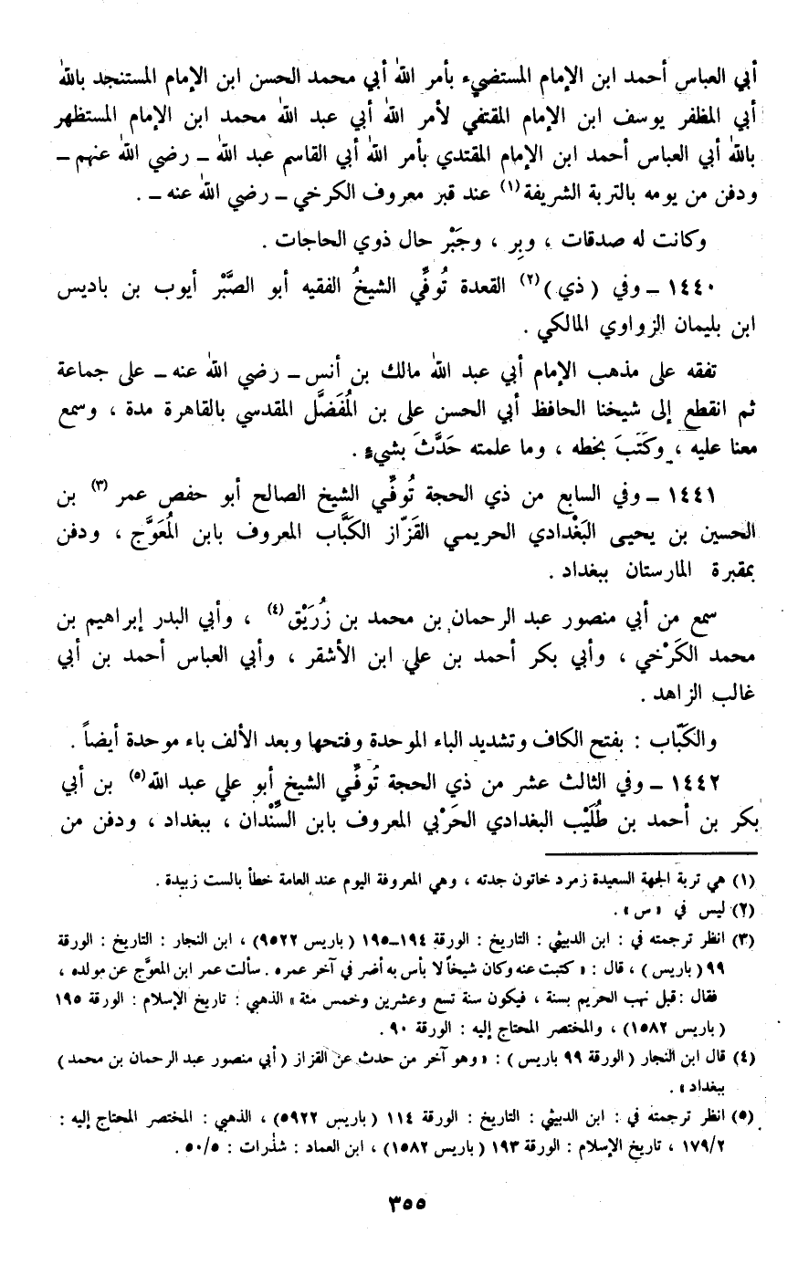 1441 - وفي السابع من ذي الحجة توفي الشيخ الصالح أبو حفص عمر بن الحسين بن يحيى البغدادي الحريمي القزاز الكباب المعروف بابن المعوج، ودفن بمقبرة المارستان ببغداد.
