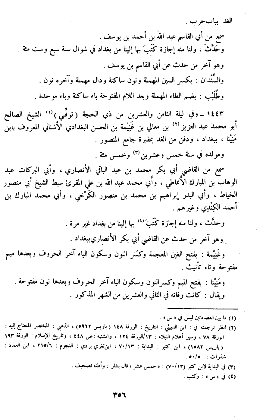 1443 - وفي ليلة الثامن والعشرين من ذي الحجة (توفي) الشيخ الصالح أبو محمد عبد العزيز بن معالي بن غنيمة بن الحسن البغدادي الأشناني المعروف بابن منينا، ببغداد، ودفن من الغد بمقبرة جامع المنصور.