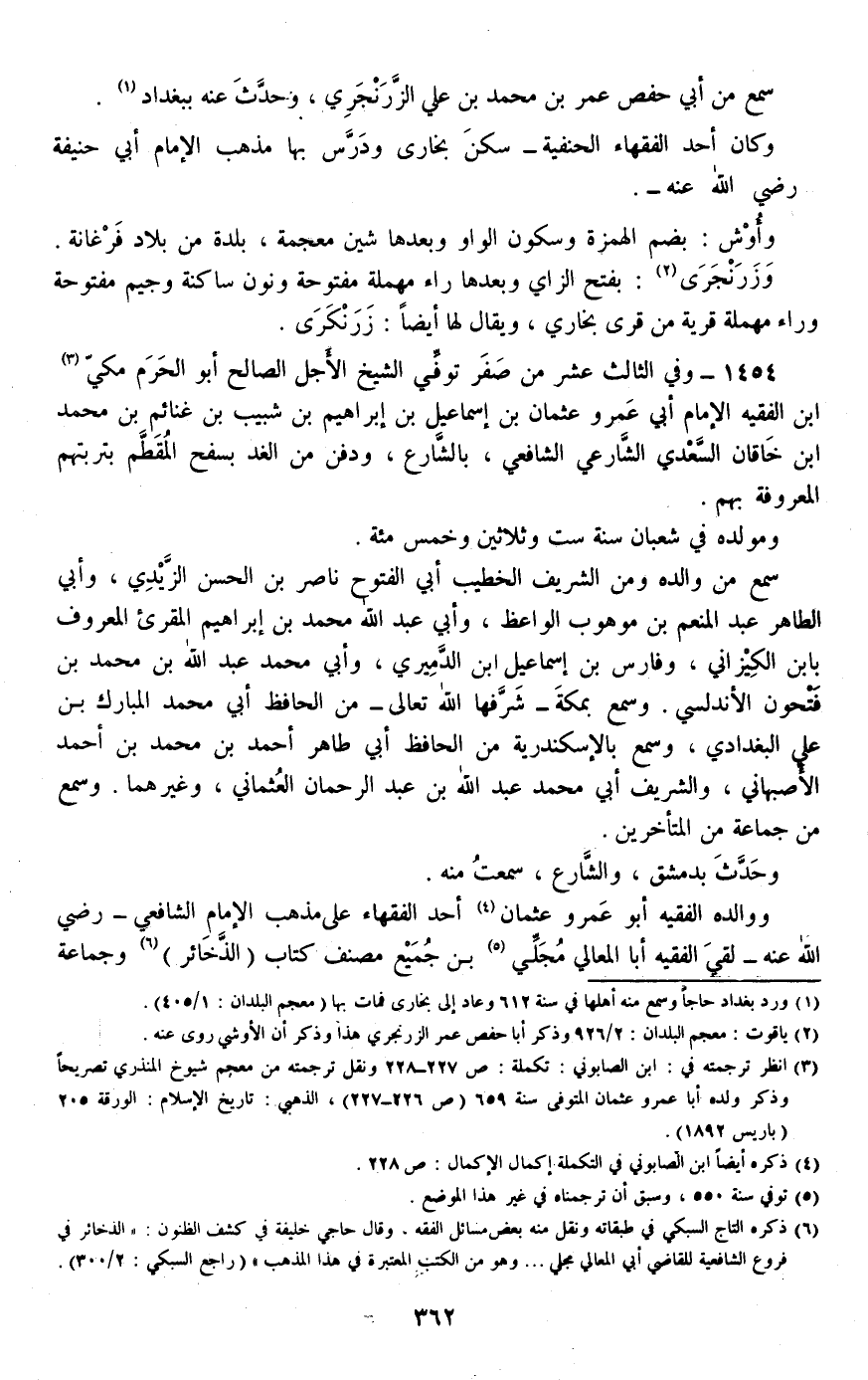 1454 - وفي الثالث عشر من صفر توفي الشيخ الأجل الصالح أبو الحرم مكي ابن الفقيه الإمام أبي عمرو عثمان بن إسماعيل بن إبراهيم بن شبيب بن غنائم بن محمد بن خاقان السعدي الشارعي الشافعي، بالشارع، ودفن من الغد بسفح المقطم بتربتهم المعروفة بهم.