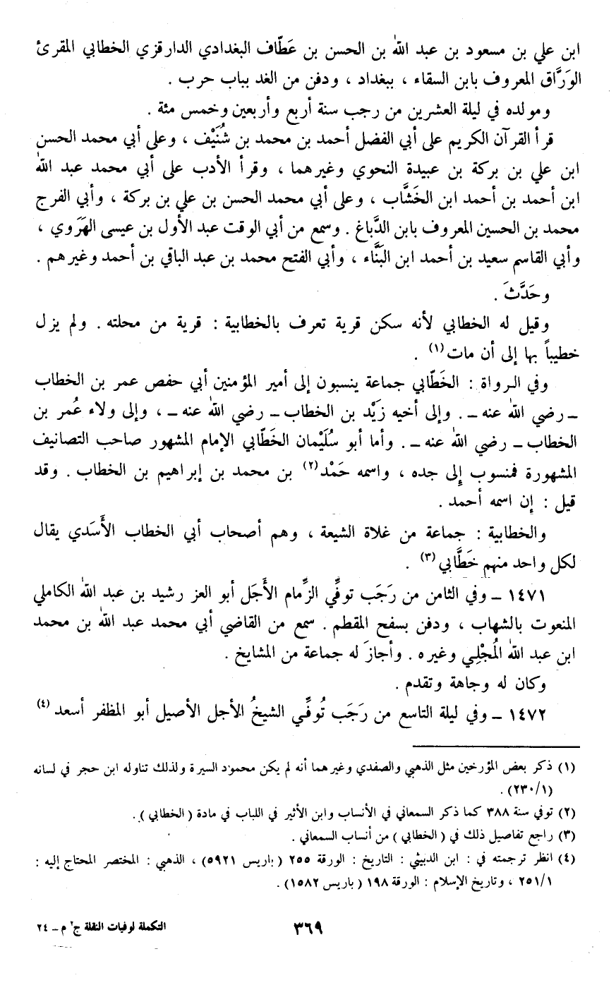 1472 - وفي ليلة التاسع من رجب توفي الشيخ الأجل الأصيل أبو المظفر أسعد ابن الفقيه الأجل أبي نصر محمد ابن الشيخ الأجل أبي الحسن علي ابن الوزير الأجل أبي نصر أحمد ابن الوزير الأجل نظام الملك أبي علي الحسن بن علي بن إسحاق بن العباس الطوسي الأصل البغدادي الدار، #370# ببغداد فجاءة، ودفن من الغد عند جده.