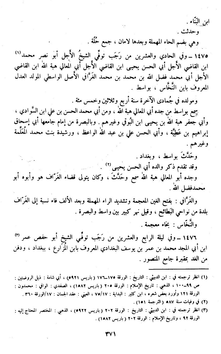 1475 - وفي الحادي والعشرين من رجب توفي الشيخ الأجل أبو نصر محمد ابن القاضي الأجل أبي الحسن يحيى ابن القاضي الأجل أبي المعالي هبة الله ابن القاضي الأجل أبي محمد فضل الله بن محمد بن محمد الغرافي الأصل الواسطي المولد العدل المعروف بابن النخاس، بواسط.