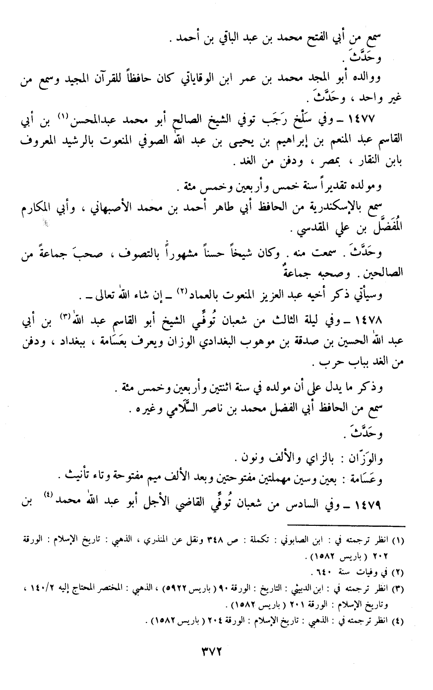 1478 - وفي ليلة الثالث من شعبان توفي الشيخ أبو القاسم عبد الله بن أبي عبد الله الحسين بن صدقة بن موهوب البغدادي الوزان ويعرف بعسامة، ببغداد، ودفن من الغد بباب حرب.