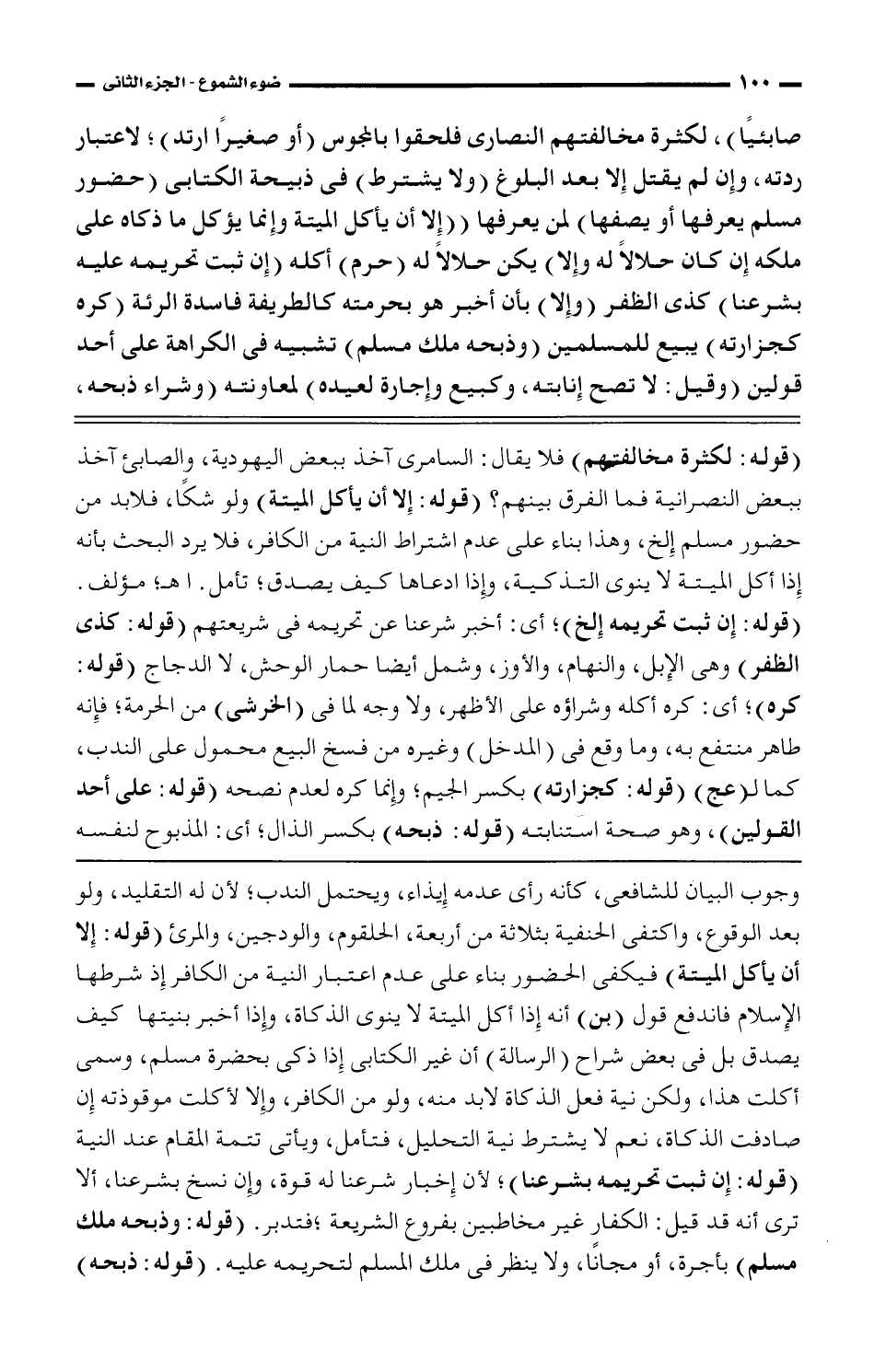 (قوله: لكثرة مخالفتهم) فلا يقال: السامرى آخذ ببعض ليهودية، والصابئ آخذ ببعض النصرانية فما الفرق بينهم؟ (قوله: إلا أن يأكل الميتة) ولو شكًا، فلابد من حضور مسلم إلخ، وهذا بناء على عدم اشتراط النية من الكافر، فلا يرد البحث بأنه إذا أكل الميتة لا ينوى التذكية، وإذا ادعاها كيف يصدق؛ تأمل. أهـ؛ مؤلف. (قوله: إن ثبت تحريمه إلخ)؛ أى: أخبر شرعنا عن تحريمه فى شريعتهن (قوله: كذى الظفر) وهى الإبل، والنهام، والأوز، وشمل أيضا حمار الوحش، لا الدجاج (قوله: كره)؛ أى: كره أكله وشراؤه على الأزهر، ولا وجه لما فى (الخرشى) من الحرمة؛ فإنه طاهر منتفع به، وما وقع فى (المدخل) وغيره من فسخ البيع محمول على الندب، كما لـ (عج) (قوله: كجزارته) بكسر الجيم؛ وإنما كره لعدم نصحه (قوله: على أحد القولين)، وهو صحة استنابته (قوله: ذبحه) بكسر الذال؛ أى: المذبوح