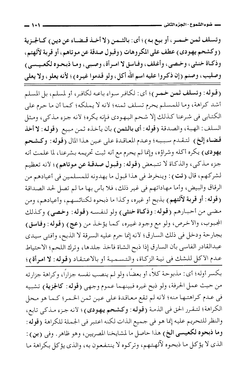 وتسلف ثمن خمر، أو بيع به)؛ أى: بالثمن (لا أخذ قضاء عن دين) كالجزية (وكشحم يهودى) عطف على المكروهات (وقبول صدقة عن موتاهم، أو قربة لآلهتم، وذكاة خنثى، وخصى، وأغلف، وفاسق لا امرأة، وصبى، وما ذبحوه لكعيسى) وصليب، وصنم (إن ذكروا عليه اسم الله أكل، ولو قدموا غيره)؛ لأنه يعلو، ولا يعلى