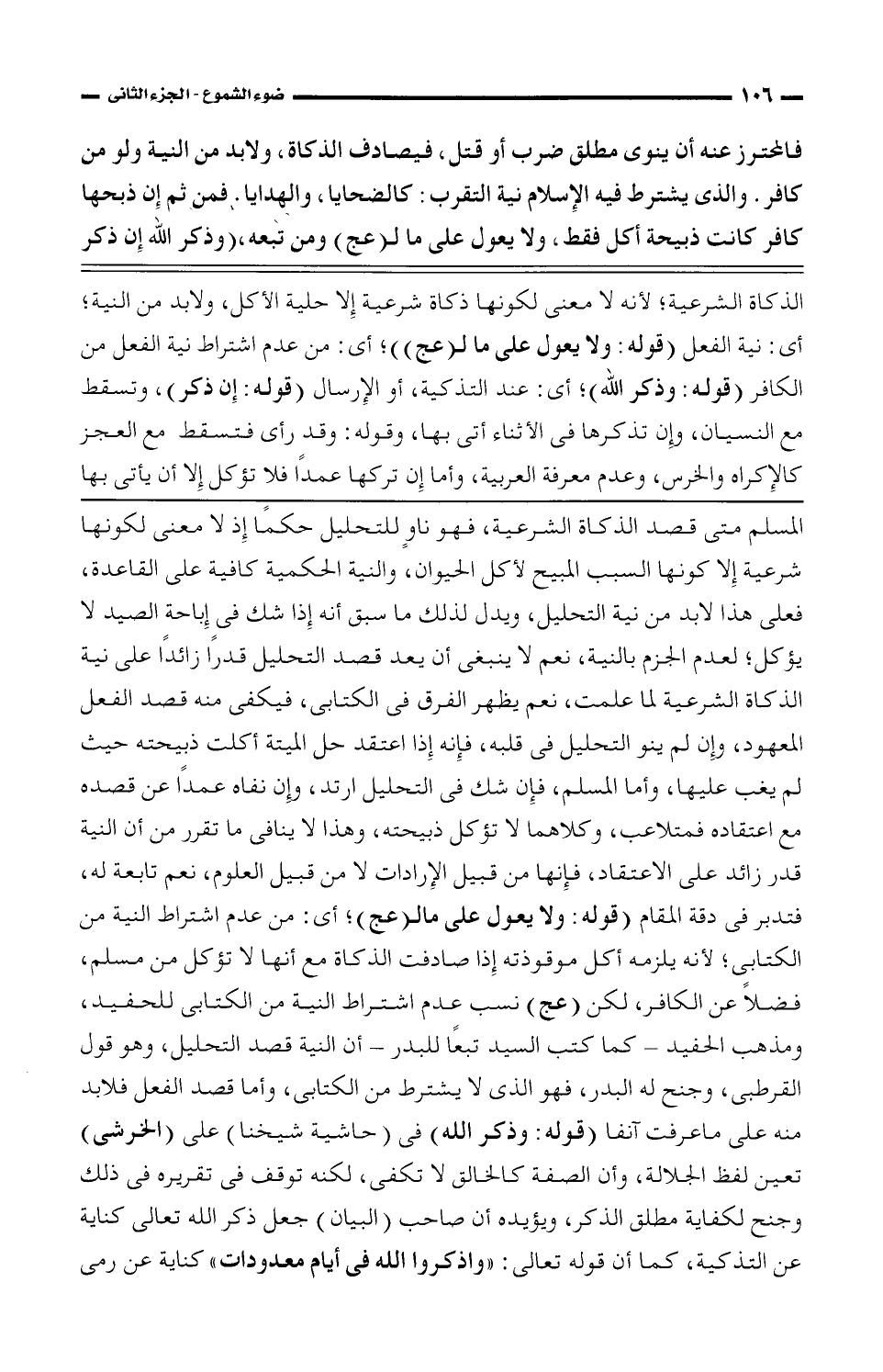 المسلم متى قصد الذكاة الشرعية، فهو ناوٍ للتحليل حكمًا إذ لا معنى لكونها شرعية إلا كونها السبب المبيح لأكل الحيوان، والنية الحكمية كافية على القاعدة، فعلى هذا لابد من نية التحليل، ويدل لذلك ما سبق أنه إذا شك فى إباحة الصيد لا يؤكل؛ لعدم الجزم بالنية، نعم لا ينبغى أن يعد قصد التحليل قدرًا زائدًا على نية الذكاة الشرعية لما علمت، نعم يظهر الفرق فى الكتابى، فيكفى منه قصد الفعل المعهود، وإن لم ينو التحليل فى قلبه، فإنه إذا اعتقد حل الميتة أكلت ذبيحته حيث لم يغب عليها، وأما المسلم، فإن شك فى التحليل ارتد، وإن نفاه عمدًا عن قصده مع اعتقاده فمتلاعب، وكلاهما لا تؤكل ذبيحته، وهذا لا ينافى ما تقرر من أن النية قدر زائد على الاعتقاد، فإنها من قبيل الإرادات لا من قبيل العلوم، نعم تابعة له، فتدبر فى دقة المقام (قوله: ولا يعول على ما لـ (عج)؛ أى: من عدم اشتراط النية من الكتابى؛ لأنه يلزمه أكل موقوذته إذا صادفت الذكاة مع أنها لا تؤكل من مسلم، فضلاً عن الكافر، لكن (عج) نسب عدم اشتراط النية من الكتابى للحفيد، ومذهب الحفيد -كما كتب السيد تبعًا للبدر- أن النية قصد التحليل، وهو قول القرطبى، وجنح له البدر، فهو الذى لا يشترط من الكتابى، وأما قصد الفعل فلابد منه على ما عرفت آنفا (قوله: وذكر الله) فى (حاشية شيخنا) على (الخرشى) تعين لفظ الجلالة، وأن الصفة كالخالق لا تكفى، لكنه توقف فى تقريره فى ذلك وجنح لكفاية مطلق الذكر، ويؤيده أن صاحب (البيان) جعل ذكر الله تعالى كناية عن التذكية، كما أن قوله تعالى: {واذكروا الله فى أيام معدودات} كناية عن رمى