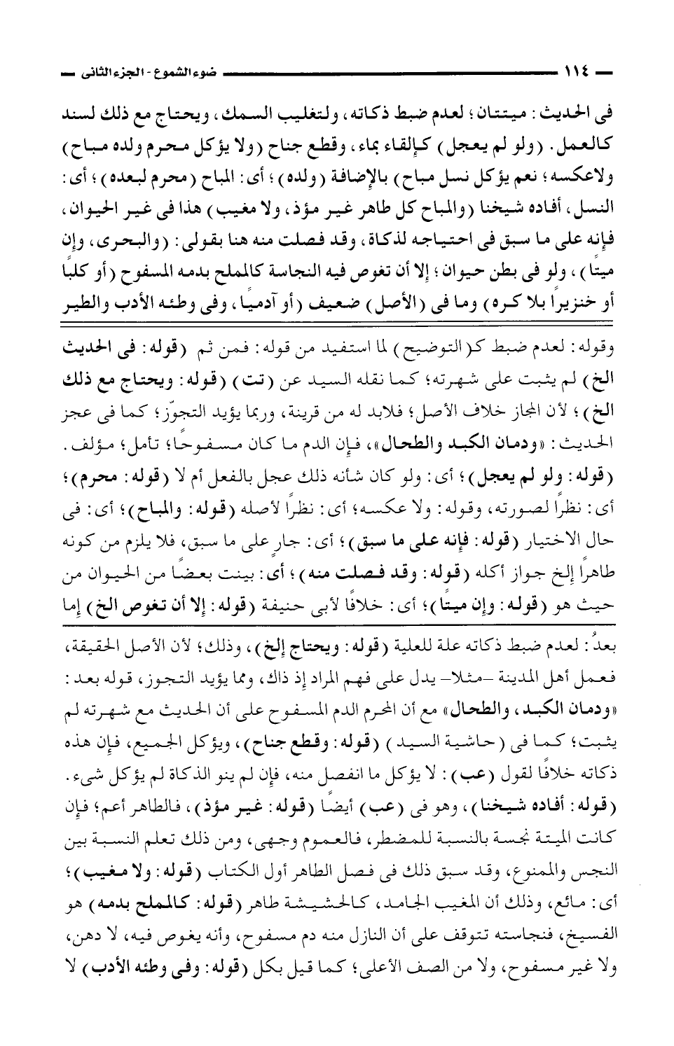 بعدُ: لعدم ضبط ذكاته علة للعلية (قوله: ويحتاج إلخ)، وذلك؛ لأن الأصل الحقيقة، فعمل أهل المدينة -مثلا- يدل على فهم المراد إذ ذاك، ومما يؤيد التجوز، قوله بعد: "ودمان الكبد، والطحال" مع أن المحرم الدم المسفوح على أن الحديث مع شهرته لم يثبت؛ كما فى (حاشية السيد) (قوله: وقطع جناح)، ويؤكل الجميع، فإن هذه ذكاته خلافًا لقول (عب): لا يؤكل ما انفصل منه، فإن لم ينو الذكاة لم يؤكل شئ. (قوله: أفاده شسيخنا)، وهو فى (عب) أيضًا (قوله: غير مؤذ)، فالطاهر أعم؛ فإن كانت الميتة نجسة بالنسبة للمضطر، فالعموم وجهى، ومن ذلك تعلم النسبة بين النجس والممنوع، وقد سبق ذلك فى فصل الطاهر أول الكتاب (قوله: ولا مغيب)؛ أى: مائع، وذلك أن المغيب الجامد، كالحشيشة طاهر (قوله: كالمملح بدمه) هو الفسيخ، فنجاسته تتوقف على أن النازل منه دم مسفوح، وأنه يغوص فيه، لا دهن، ولا غير مسفوح، ولا من الصف الأعلى؛ كما قيل بكل (قوله: وفى وطئه الأدب) لا