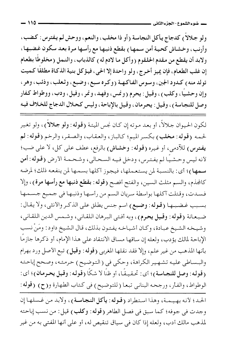 الحد؛ لأنه بهيمة، وهذا استطرد (قوله: يأكل النجاسة)، ولابد من غسلها إن وجدت فى جوفه؛ كما سبق فى فصل الطاهر (قوله: وكلب) قيل: من نسب إباحته لمذهب مالك أدب، ولعله إذا كان فى سياق تنقيص له، أو على أنها المفتى به من غير