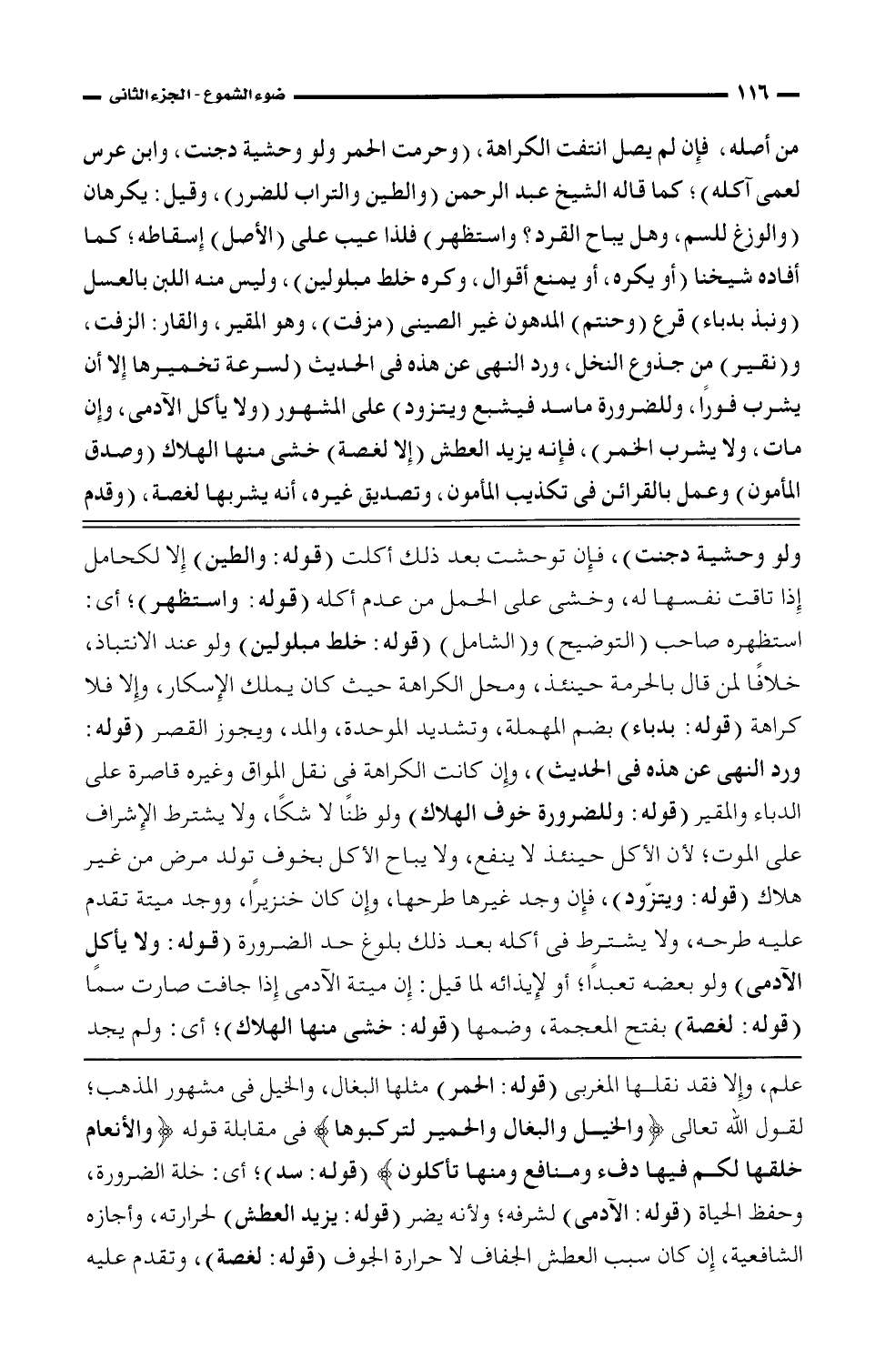 ولو وحشية دجنت)، فإن توحشت بعد ذلك أكلت (قوله: والطين) إلا لكحامل إذا تاقت نفسها له، وخشى على الحمل من عدم أكله (قوله: واستظهر)؛ أى: استظهره صاحب (التوضيح) و (الشامل) (قوله: خلط مبلولين) ولو عند الانتباذ، خلافًا لمن قال بالحرمة حينئذ، ومحل الكراهة حيث كان يملك الإسكار، وإلا فلا كراهة (قوله: بدباء) بضم المهملة، وتشديد الموحدة، والمد، ويجوز القصر (قوله: ورد النهى عن هذه فى الحديث)، وإن كانت الكراهة فى نقل المواق وغيره قاصرة على الدباء والمقير (قوله: وللضرورة خوف الهلاك) ولو ظنًا لا شكًا، ولا يتشرط الإشراف على الموت؛ لأن الأكل حيئنذ لا ينفع، ولا يباح الأكل بخوف تولد مرض من غير هلاك (قوله: ويتزوّد)، فإن وجد غيرها طرحها، وإن كان خنزيرًا، ووجد ميتة تقدم عليه طرحه، ولا يشترط فى أكله بعد ذلك بلوغ حد الضرورة (قوله: ولا يأكل الآدمى) ولو بعضه تعبدًا؛ أو لإيذائه لما قيل: إن ميتة الآدمى إذا جافت صارت سمًا (قوله: لغصة) بفتح المعجمة، وضمها (قوله: خشى منها الهلاك)؛ أى: ولم يجد