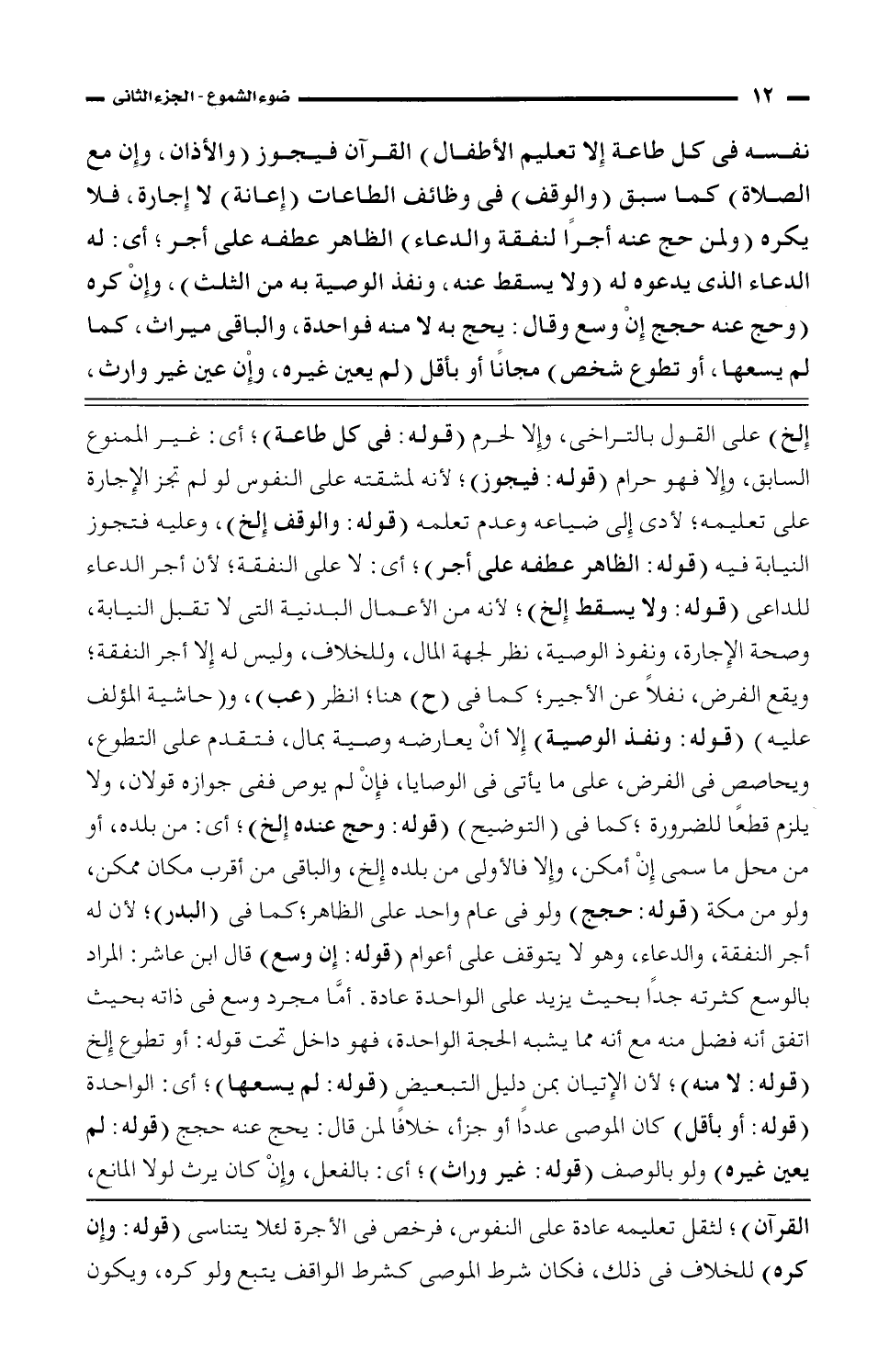 إلخ) على القول بالتراخى، وإلا لحرم (قوله: فى كل طاعة)؛ أى: غير الممنوع السابق، وإلا فهو حرام (قوله: فيجوز)؛ لأنه لمشقته على النفوس لو لم تجز الإجارة على تعليمه؛ لأدى إلى ضياعه وعدم تعلمه (قوله: والوقف إلخ)، وعليه فتجوز النيابة فيه (قوله: الظاهر عطفه على أجر)؛ أى: لا على النفقة؛ لأن أجر الدعاء للداعى (قوله: ولا يسقط إلخ)؛ لأنه من الأعمال البدنية التى لا تقبل النيابة، وصحة الإجارة، ونفوذ الوصية، نظر لجهة المال، وللخلاف، وليس له إلا أجر النفقة؛ ويقع الفرض، نفلاً عن الأجير؛ كما فى (ح) هنا؛ انظر (عب)، و (حاشية المؤلف عليه) (قوله: ونفذ الوصية) إِلا أنْ يعارضه وصية بمال، فتقدم على التطوع، ويحاصص فى الفرض، على ما يأتى فى الوصايا، فإِنْ لم يوص ففى جوازه قولان، ولا يلزم قطعًا للضرورة؛ كما فى (التوضيح) (قوله: وحج عنده إلخ)؛ أى: من بلده، أو من محل ما سمى إِنْ أمكن، وإلا فالأولى من بلده إِلخ، والباقى من أقرب مكان ممكن، ولو من مكة (قوله: حجج) ولو فى عام واحد على الظاهر؛ كما فى (البدر)؛ لأن له أجر النفقة، والدعاء، وهو لا يتوقف على أعوام (قوله: إن وسع) قال ابن عاشر: المراد بالوسع كثرته جدًا بحيث يزيد على الواحدة عادة. أمَّا مجرد وسع فى ذاته بحيث اتفق أنه فضل منه مع أنه مما يشبه الحجة الواحدة، فهو داخل تحت قوله: أو تطوع إِلخ (قوله: لا منه)؛ لأن الإتيان بمن دليل التبعيض (قوله: لم يسعها)؛ أى: الواحدة (قوله: أو بأقل) كان الموصى عدداً أو جزأ، خلافًا لمن قال: يحج عنه حجج (قوله: لم يعين غيره) ولو بالوصف (قوله: غير وارث)؛ أى: بالفعل، وإِنْ كان يرث لولا المانع،