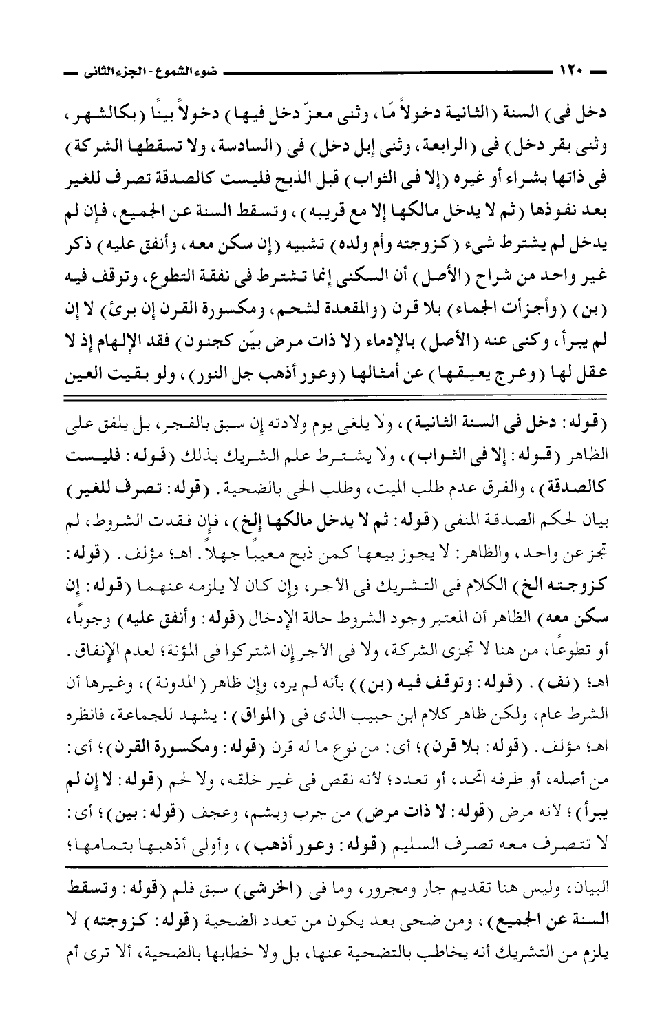 دخل فى) (الثانية دخولاً مّا، وثنى معزّ دخل فيها) دخولاً بينًا (بكالشهر، وثنى بقر دخل) فى (الرابعة، وثنى إبل دخل) فى (السادس، ولا تسقطها الشركة) فى ذاتها بشراء أو غيره (إلا فى الثواب) قبل الذبح فليست كالصدقة تصرف للغير بعد نفوذها (ثم لا يدخل مالكها إلا مع قريبه)، وتسقط السنة عن الجميع، فإن لم يدخل لم يشترط شئ (كزوجته وأم ولده) تشبيه (إن سكن معه، وأنفق عليه) ذكر غير واحد من شراح (الأصل) أن السكنى إنما تشترط فى نفقة التطوع، وتوقف فيه (بن) (وأجزأت الجماء) بلا قرن (والمقعدة لشحم، ومكسورة القرن إن برئ) لا إن لم يبرأ، وكنى عنه (الأصل) بالإدماء (لا ذات مرض بيّن كجنون) فقد الإلهام إذ لا عقل لها (وعرج يعيقها) عن أمثالها (وعور أذهبي جل النور)، ولو بقيت العين
