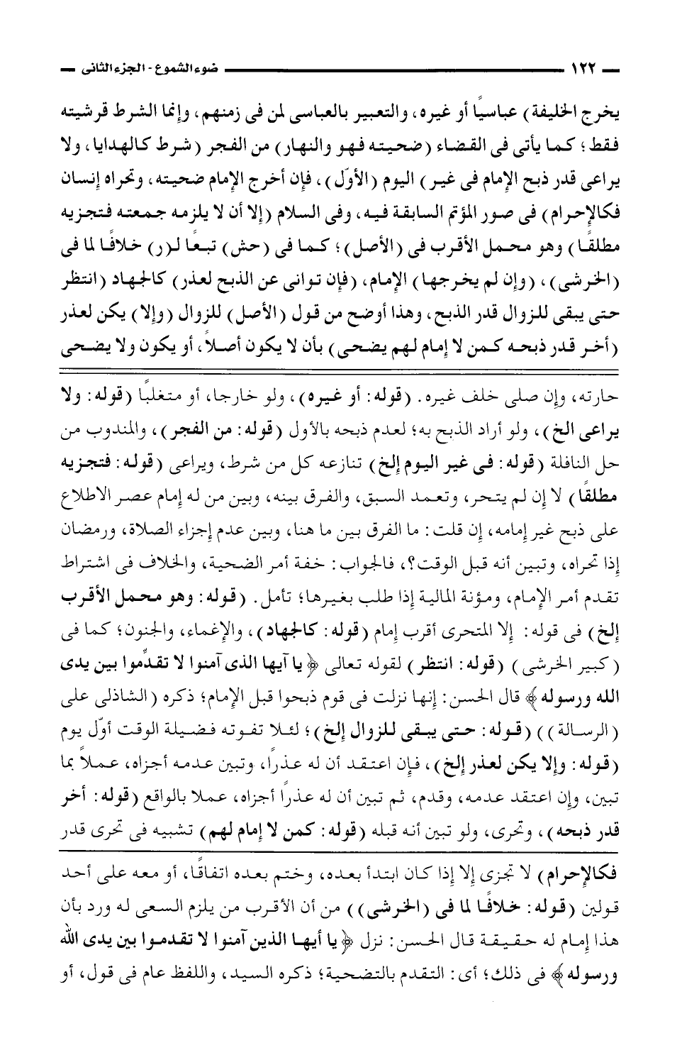 فكالإحرام لا تجزى إلا إذا كان ابتدأ بعده، وختم بعده اتفاقًا، أو معه على أحد قولين (قوله: حلافًا لما فى (الخرشى)) من أن الأقرب من يلزم السعى له ورد بأن هذا إمام له حقيقة قال الحسن: نزل {يا أيها الذين آمنوا لا تقدموا بين يدى الله ورسوله} فى ذلك؛ ألأى: التقدم بالتضحية؛ ذكره السيد، واللفظ عام فى قول، أو
