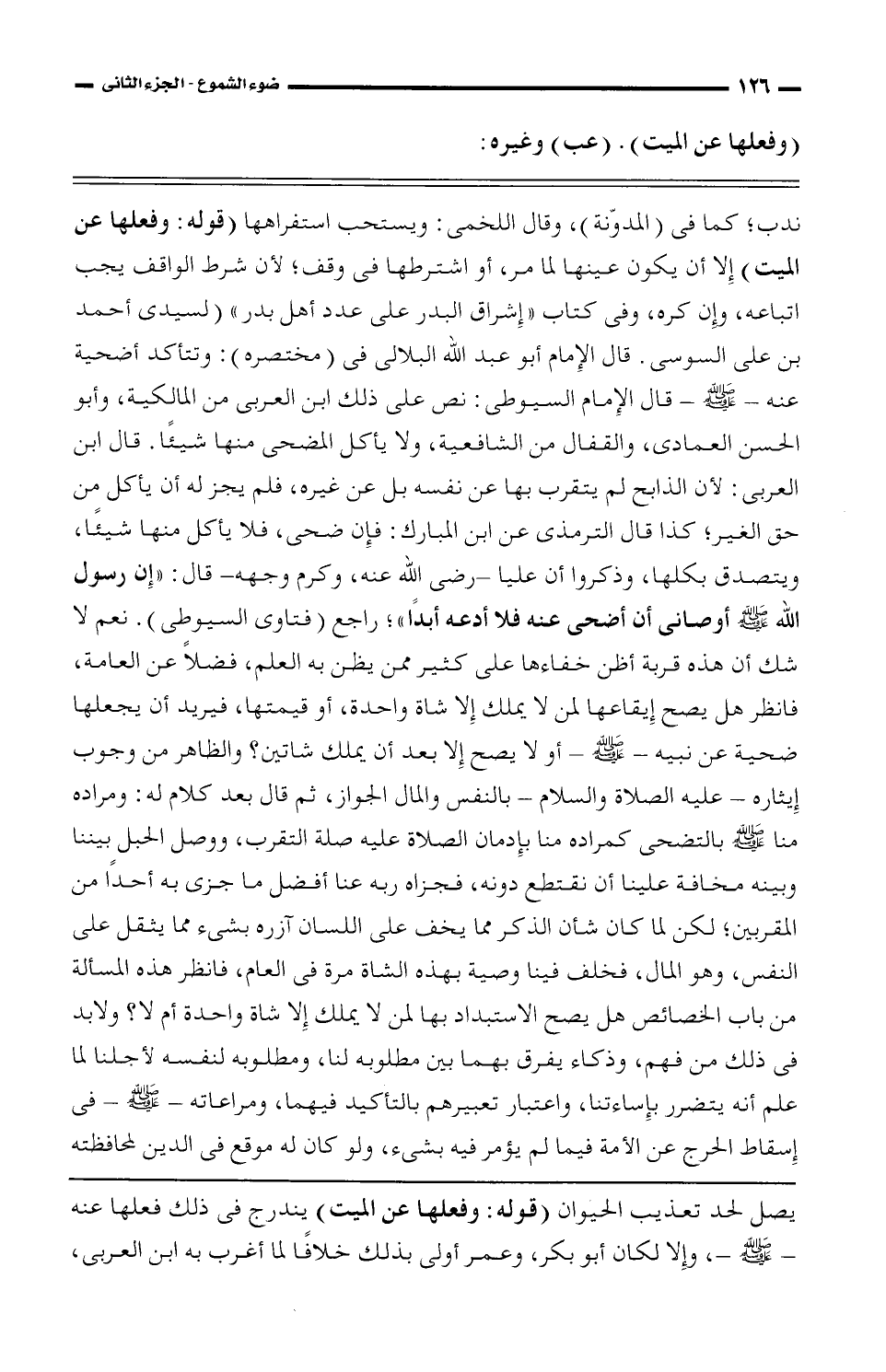 يصل لحد تعذيب الحيوان (قوله: وفعلها عن الميت) يندرج في ذلك فعلها عنه- صلى الله عليه وسلم-، وإلا لكان أبو بكر، وعمر أولى بذلك خلافًا لما أغرب به ابن العربي،