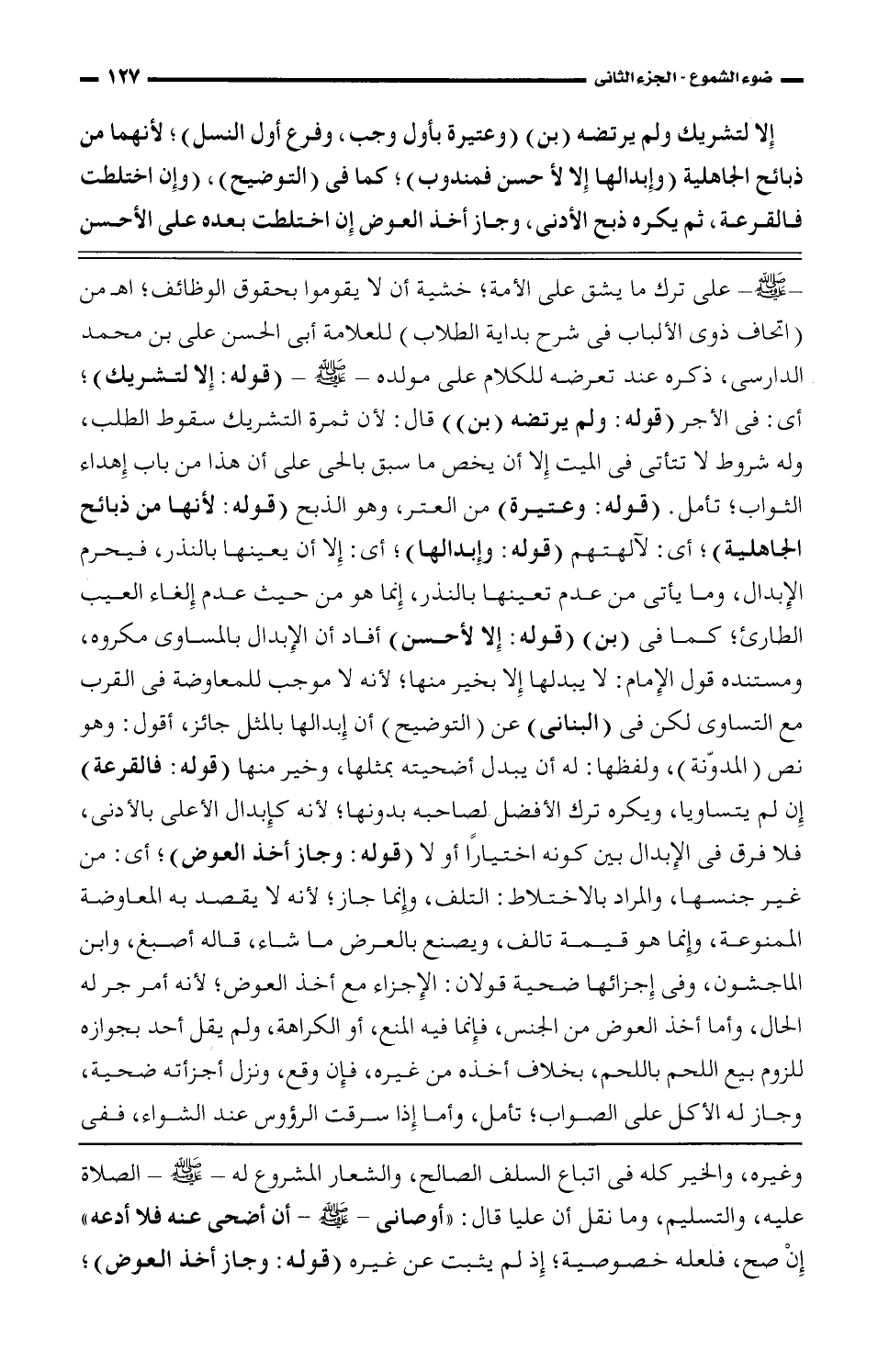 - صلى الله عليه وسلم- على ترك ما يشق على الأمة؛ خشية أن لا يقوموا بحقوق الوظائف؛ اهـ من (إتحاف ذوي الألباب في شرح بداية الطلاب) للعلامة أبي الحسن علي بن محمد الدارسي، ذكره عند تعرضه للكلام على مولده- صلى الله عليه وسلم- (قوله: إلا لتشريك)؛ أي: في الأجر (قوله: ولم يرتضه (بن)) قال: لأن ثمرة التشريك سقوط الطلب، وله شروط لا تتأتى في الميت إلا أن يخص ما سبق بالحي على أن هذا إهداء الثواب؛ تأمل. (قوله: وعتيرة) من العتر، وهو الذبح (قوله: لأنها من ذبائح الجاهلية)؛ أي: لآلهتهم (قوله: وإبدالها)؛ إنما هو من حيث عدم إلغاء العيب الطارئ؛ كما في (بن) (قوله: إلا لأحسن) أفاد أن الإبدال بالمساوي مكروه، ومستنده قول الإمام: لا يبدلها إلا بخير منها؛ لأنه لا موجب للمعاوضة في القرب مع التساوي لكن في (البناني) عن (التوضيح) أن إبدالها بالمثل جائز، أقول: وهو نص (المدونة)، ولفظها: له أن يبدل أضحيته بمثلها، وخير منها (قوله: فالقرعة) إن لم يتساويا، ويكره ترك الأفضل لصاحبه بدونها؛ لأنه كإبدال الأعلى بالأدنى، فلا فرق في الإبدال بين كونه اختيارًا أو لا (قوله: وجاز أخذ العوض)؛ أي: من غير جنسها، والمراد بالاختلاط: التلف، وإنما جاز؛ لأنه لا يقصد به المعاوضة الممنوعة، وإنما هو قيمة تالف، ويصنع بالعرض ما شاء، قاله أصبغ، وابن الماجشون، وفي إجزائها ضحية قولان: الإجزاء مع أخذ العوض؛ لأنه مر جر له الحال، وأما أخذ العوض من الجنس، فإنما فيه المنع، أو الكراهة، ولم يقل أحد بجوازه للزوم بيع اللحم باللحم، بخلاف أخذه من غيره، فإن وقع، ونزل أجزأته ضحية، وجاز له الأكل على الصواب؛ تأمل، وأما إذا سرقت الرؤوس عند الشواء، ففي