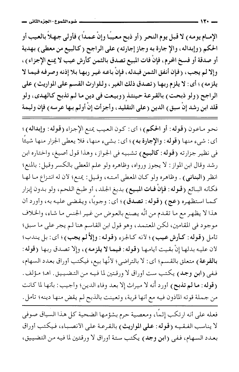 الإمام يومه) لا قبل يوم النحر (أو ذبح معيبًا وإن عمدًا) فأولى جهلًا بالعيب أو الحكم (وإبداله، والإجارة به وجاز إجارته) على الراجح (كالبيع من معطي) بهدية أو صدقة أو فسخ المحرم، فإن فات المبيع تصدق بالثمن عيب لا يمنع الإجزاء)، وإلا لم يجب، (فإن أنفق الثمن فبدله، فإن باعه غير ربها بلا إذنه وصرفه فيما لا يلزمه)؛ أي: لا يلزم ربها (تصدق ذلك الغير، وللوارث القسم على المواريث) على الراجح (ولو ذبحت) بالقرعة حينئذ (وبيعت في دين ما لم تذبح كالهدي، ولو قلد ابن رشد إن سبق) الدين (على التقليد، وأجزأت إن أولم بها عرسه) فإن وليمة