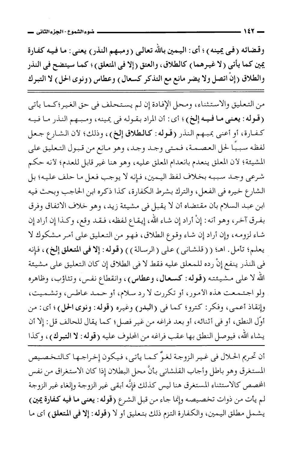 من التعليق والاستثناء، ومحل الإفادة إن لم يستحلف في حق الغير؛ كما يأتي (قوله: يعني ما فيه إلخ)؛ أي: أن المراد بقوله في يمينه، ومبهم النذر ما فيه كفارة، أو أعني بمبهم النذر (قوله: كالطلاق إلخ)، وذلك؛ لأن الشارع جعل لفظه سببًا حل العصمة، فمتى وجد وجد، وهو مانع من قبول التعليق على المشيئة؛ لأن المعلق ينعدم بانعدام المعلق عليه، وهو هنا غير قابل للعدم؛ لأنه حكم شرعي وجد سببه بخلاف لفظ اليمين، فإنه لا يوجب فعل ما حلف عليه؛ بل الشارع خيره في الفعل، والترك بشرط الكفارة، كذا ذكره ابن الحاجب وبحث فيه ابن عبد السلام بأن مقتضاه أن لا يقبل في مشيئة زيد، وهو خلاف الاتفاق وفرق بفرق آخر، وهو أنه: إن أراد إن شاء الله، إيقاع لفظه، فقد وقع، وكذا إن أراد إن شاء لزومه، وإن أراد إن شاء وقوع الطلاق، فهو من التعليق على أمر مشكوك لا يعلم؛ تأمل. اهـ؛ ((قلشاني) على (الرسالة)) (قوله: إلا في المتعلق إلخ)، فإنه في النذر ينفع إن رده للمعلق عليه فقط لا في الطلاق إن كان التعليق على مشيئة الله لا على مشيئته (قوله: كسعال، وعطاس)، وانقطاع نفس، وتثاؤب، وظاهره ولو اجتمعت هذه الأمور، أو تكررت لا رد سلام، أو حمد عاطس، وتشميت، وإنقاذ أعمى، وفكر: كتور؛ كما في (البدر) وغيره (قوله: ونوى الحل)؛ أي: من أول النطق، أو في أثنائه، أو بعد فراغه من غير فصل؛ كما يقال للحالف قل: إلا أن يشاء الله، فيوصل النطق بها عقب فراغه من المحلوف عليه (قوله: لا التبرك)، وكذا