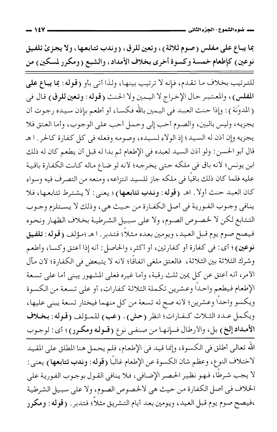للترتيب بخلاف ما تقدم، فإنه لا ترتيب بينها، ولذا أتى بأو (قوله: بما يباع على المفلس)، والمعتبر حال الإخراج لا اليمين ولا الحنث (قوله: وتعين للرق) قال في (المدونة): وإذا حنث لعبد في اليمين بالله فكسا، أو أطعم بإذن سيده رجوت أن يجزيه، وليس بالبين، والصوم أحب إلي وحمل أحب على الوجوب، وأما العتق فلا يجزيه وإن أذن له السيد؛ إذ الولاء لسيده، وصومه وفعله في كل كفارة كالحر. اهـ قال أبو الحسن: ولو أذن السيد لعبده في الإطعام ثم بدا له قبل أن يطعم كان له ذلك ابن يونس؛ لأنه باق في ملكه حتى يخرجه؛ لأنه لو ضاع ماله كانت الكفارة باقية عليه فلما كان ذلك باقيًا في ملكه جاز للسيد انتزاعه، ومنعه من التصرف فيه وسواء كان العبد حنث أولا. اهـ (قوله: وندب تتابعها)؛ يعني: لا يشترط تتابعها، فلا ينافي وجوب الفورية في أصل الكفارة من حيث هي، وذلك لا يستلزم وجوب التتابع لكن لا لخصوص الصوم، ولا على سبيل الشرطية بخلاف الظهار ونحوه فيصح صوم يوم قبل العيد، ويومين بعده مثلًا؛ فتدبر. اهـ؛ مؤلف (قوله: تلفيق نوعين)؛ أي: في كفارة أو كفارتين، أو أكثر، والحاصل: أنه إذا أعتق وكسا، وأطعم وشرك الثلاثة بين الثلاثة، فالعتق ملغي اتفاقًا؛ لأنه لا يتبعض في الكفارة؛ لأن مآل الأمر، أنه أعتق عن كل يمين ثلث رقبة، وأما غيره فعلى المشهور يبنى أما على تسعة الإطعام فيطعم واحدًا وعشرين تكملة الثلاث كفارات، أو على تسعة من الكسوة ويكسو واحدًا وعشرين؛ لأنه صح له تسعة من كل منهما فيختار تسعة يبنى عليها، ويكمل عدد الثلاث كفارات؛ انظر (حش). (عب) للمؤلف (قوله: بخلاف الأمداد إلخ) بل، والأرطال فإنها من صنفي نوع (قوله ومكرر)؛ أي: لوجوب