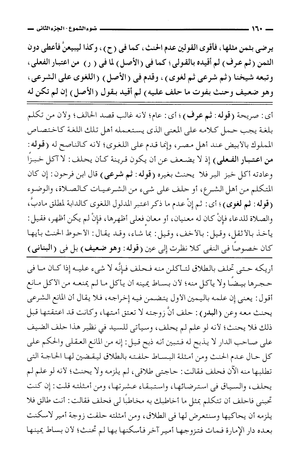 أي: صريحة (قوله: ثم عرف)؛ أي: عام؛ لأنه غالب قصد الحالف؛ ولأن من تكلم بلغة يجب حمل كلامه على المعنى الذي يستعمله أهل تلك اللغة كاختصاص المملوك بالأبيض عند أهل مصر، وإنما قدم على اللغوي؛ لأنه كالناصح له (قوله: من اعتبار الفعلي) إذ لا يضعف عن أن يكون قرينة كأن يحلف: لا آكل خبرًا وعادته أكل خبز البر فلا يحنث بغيره (قوله: ثم شرعي) قال ابن فرحون: إن كان المتكلم من أهل الشرع، أو حلف على شيء من الشرعيات كالصلاة، والوضوء (قوله: ثم لغوي)؛ أي: ثم إن عدم ما ذكر اعتبر المدلول اللغوي كالدابة لمطلق ما دب، والصلاة للدعاء فإن كان له معنيان، أو معان فعلى أظهرها، فإن لم يكن أظهر، فقيل: يأخذ بالأثقل، وقيل: بالأخف، وقيل: بما شاء، وقد يقال: الأحوط الحنث بأيها كان خصوصًا في النفي كلا نظرت إلى عين (قوله: وهو ضعيف) بل في (البناني)
