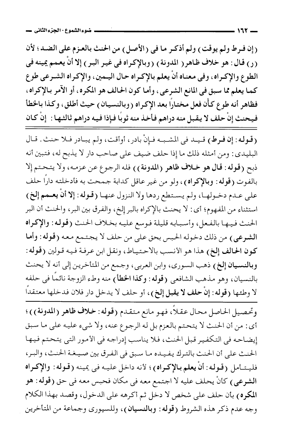 (إن فرط ولم يوقت) ولم أذكر ما في (الأصل) من الحنث بالعزم على الضد؛ لأن (ر) قال: هو خلاف ظاهر (المدونة) (وبالإكراه في غير البر) إلا أن يعمم يمينه في الطوع والإكراه، وفي معناه أن يعلم بالإكراه حال اليمين، والإكراه الشرعي طوع كما يعلم مما سبق في المانع الشرعي، وأما كون الحالف هو المكره، أو الآمر بالإكراه، فظاهر أنه طوع كأن فعل مختارًا بعد الإكراه (وبالنسيان) حيث أطلق، وكذا بالخطأ فيحنث إن حلف لا يقبل منه دراهم فأخذ منه ثوبًا فإذا فيه دراهم ثالثها: إن كان