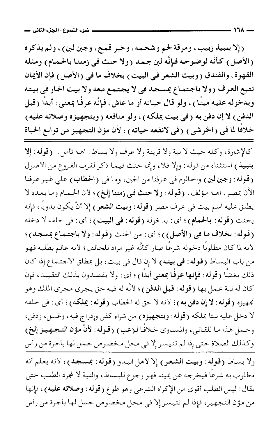 (إلا بنبيذ زبيب، ومرقة لحم وشحمه، وخبز قمح، وجبن لبن)، ولم يذكره (الأصل) كأنه لوضوحه فإنه لبن جمد (ولا حنث في زمننا بالحمام) ومثله القهوة، والفندق (وبيت الشعر في البيت) بخلاف ما في (الأصل) فإن الأيمان تتبع العرف (ولا باجتماع بمسجد في لا يجتمع معه ولا بيت الجار في بيته وبدخوله عليه ميتًا)، ولو قال حياته أو ما عاش، فإنه عرفًا بمعنى: أبدًا (قبل الدفن) لا إن دفن به (في بيت يملكه)، ولو منافعه (وبتجهيزه وصلاته عليه) خلافًا لما في (الخرشي) (في لانفعه حياته)؛ لأن مؤن التجهيز من توابع الحياة