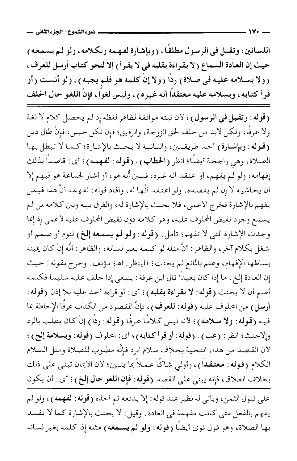 اللسانين، وتقبل في الرسول مطلقًا، (وبإشارة لفهمه وبكلامه، ولو لم يسمعه) حيث إن العادة السماع (لا بقراءة بقلبه في لا يقرأ) إلا لنحو كتاب أرسل للعرف، (ولا بسلامه عليه في صلاة) ردًا (ولا إن كلمه هو فلم يجبه)، ولو أنست (أو قرأ كتابه، وبسلامه عليه معتقدًا أنه غيره)، وليس لغوًا، فإن اللغو حال الحلف