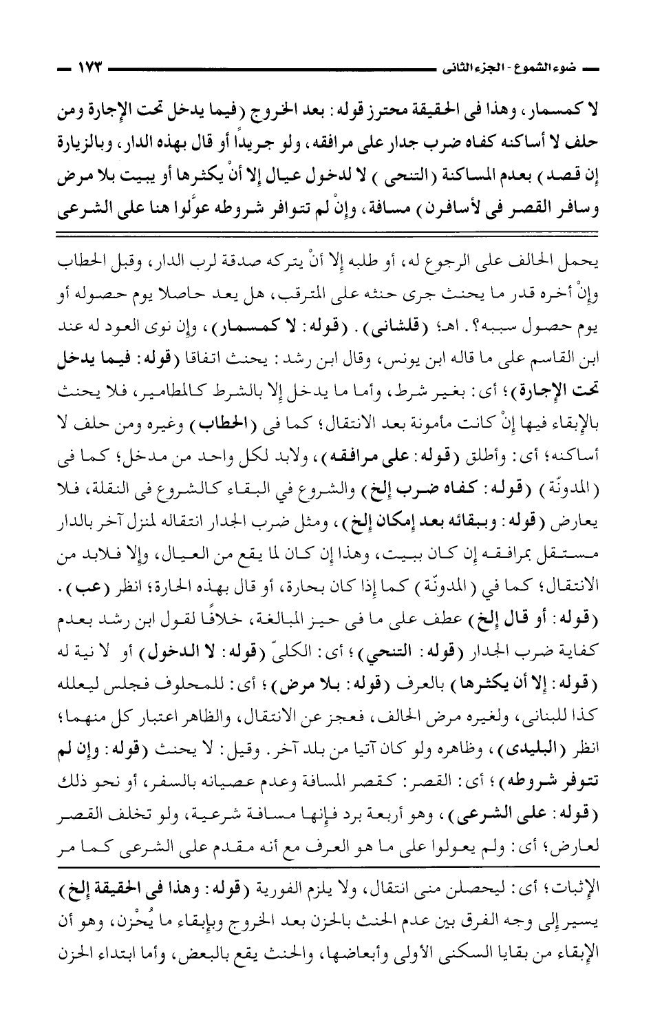 يحمل الحالف على الرجوع له، أو طلبه إلا أن يتركه صدقة لرب الدار، وقبل الحطاب وإن أخره قدر ما يحنث جرى حنثه على المترقب، هل يعد حاصلًا يوم حصوله أو يوم حصول سببه؟ . اهـ؛ (قلشاني). (قوله: لا كمسمار)، وإن نوى العود له عند ابن القاسم على ما قاله ابن يونس، وقال ابن رشد: يحنث اتفاقًا (قوله: فيما يدخل تحت الإجارة)؛ أي: بغير شرط، وأما ما يدخل إلا بالشرط كالمطامير، فلا يحنث بالإبقاء فيها إن كانت مأمونة بعد الانتقال؛ كما في (الحطاب) وغيره من حلف لا أساكنه؛ أي: وأطلق (قوله: على مرافقه)، ولابد لكل واحد من مدخل؛ كما في (المدونة (قوله: كفاه ضرب إلخ) والشروع في البقاء كالشروع في النقلة، فلا يعارض (قوله: وببقائه بعد إمكان إلخ)، ومثل ضرب الجدار انتقاله لمنزل آخر بالدار مستقل بمرافقه إن كان ببيت، وهذا إن كان لما يقع من العيال، وإلا فلا بد من الانتقال؛ كما في (المدونة) كما إذا كان بحارة، أو قال بهذه الحارة؛ انظر (عب). (قوله: أو قال إلخ) عطف على ما في حيز المبالغة، خلافًا لقول ابن رشد بعدم كفاية ضرب الجدار (قوله: التنحي)؛ أي: الكلى (قوله: لا الدخول) أو لا نية له (قوله: إلا أن يكثرها) بالعرف (قوله: بلا مرض)؛ أي: للمحلوف فجلس ليعلله كذا للبناني، ولغيره مرض الحالف، فعجز عن الانتقال، والظاهر اعتبار كل منهما؛ انظر (البليدي)، وظاهره ولو كان آتيا من بلد آخر. وقيل: لا يحنث (قوله: وإن لم تتوفر شروطه)؛ أي: القصر: كقصر المسافة وعدم عصيانه بالسفر، أو نحو ذلك (قوله: على الشرعي)، وهو أربعة برد فإنها مسافة شرعية، ولو تخلف القصر لعارض؛ أي: ولم يعولوا على ما هو العرف مع أنه مقدم على الشرعي كما مر