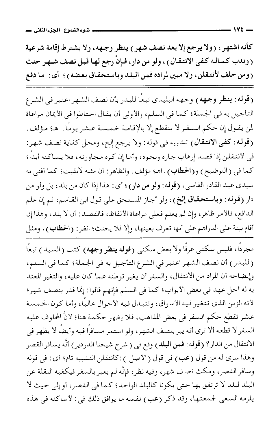 مجردًا فليس سكنى عرفًا ولا بعض سكنى (فوله ينظر وجهه) كتب (السيد) تبعًا (للبدر) أن نصف الشهر اعتبر في الشرع التأجيل به في الجملة؛ كما في السلم، وإيضاحه أن المراد من الانتقال، والسفر أن يغير توطنه عما كان عليه، والتغير المعتد به له أجل عهد في بعض الأبواب؛ كما في السلم فإنهم قالوا: إنما قدر بنصف شهر؛ لأنه الزمن الذي تتغير فيه الأسواق، وتتبدل فيه الأحوال غالبًا، وأما كون الخمسة عشر تقطع حكم السفر في بعض المذاهب، فلا يظهر حكمه هنا؛ لأن المحلوف عليه السفر لا قطعه ألا ترى أنه يبر بنصف الشهر، ولو استمر مسافرًا فيه وأيضًا لا يظهر في الانتقال من الدار؟ (قوله: فمن البلد) وقع في (شرح شيخنا الدردير) أنه يسافر القصر وهذا سري له من قول (عب) في قول (الأصل): كأنتقلن التشبيه تام؛ أي: في قوله وسافر القصر، ومكث نصف شهر، وفيه نظر، فإنه لم يعبر بالسفر فيكفيه النقلة عن البلد لبلد لا ترتفق بها حتى يكونا كالبلد الواحد؛ كما في القصر، أو إلى حيث لا يلزمه السعي لجمعتها، وقد ذكر (عب) نفسه ما يوافق ذلك في: لأساكنه في هذا
