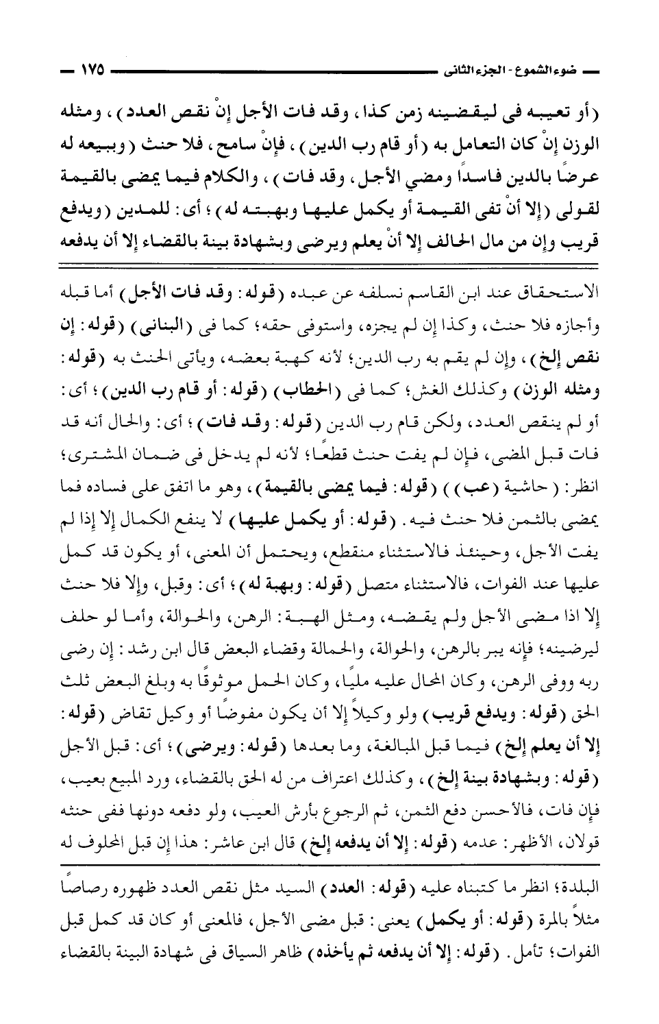 (أو تعيبه في ليقضينه زمن كذا، وقد فات الأجل إن نقص العدد)، ومثله الوزن إن كان التعامل به (أو قام رب الدين)، فإن سامح، فلا حنث (وببيعه له عرضًا بالدين فاسدًا ومضي الأجل، وقد فات)، والكلام فيما يمضي بالقيمة لقولي (إلا أن تفي القيمة أو يكمل عليها وبهبته له)؛ أي: للمدين (ويدفع قريب وإن من مال الحالف إلا أن يعلم ويرضى وبشهادة بينة بالقضاء إلا أن يدفعه