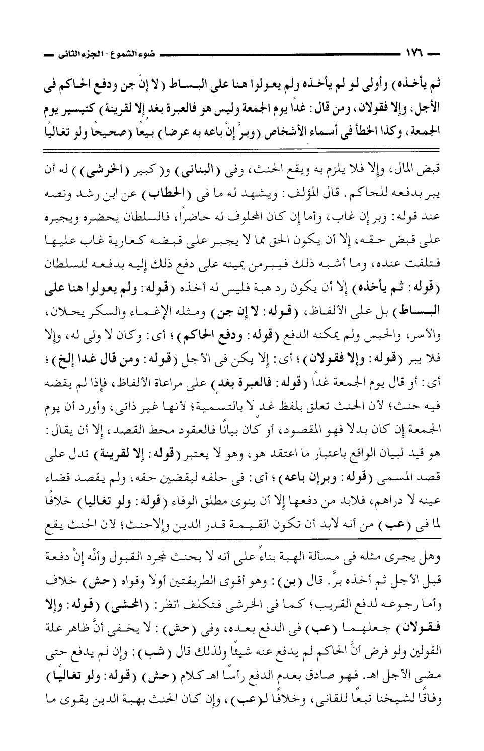 ثم يأخذه) وأولى لو لم يأخذه ولم يعولوا هنا على البساط (لا إن جن ودفع الحاكم في الأجل، وإلا فقولان، ومن قال: غدًا يوم الجمعة وليس هو فالعبرة بغد إلا لقرينة) كتيسير يوم الجمعة، وكذا الخطأ في أسماء الأشخاص (وبر إن باعه به عرضا) بيعًا (صحيحًا ولو تغاليًا