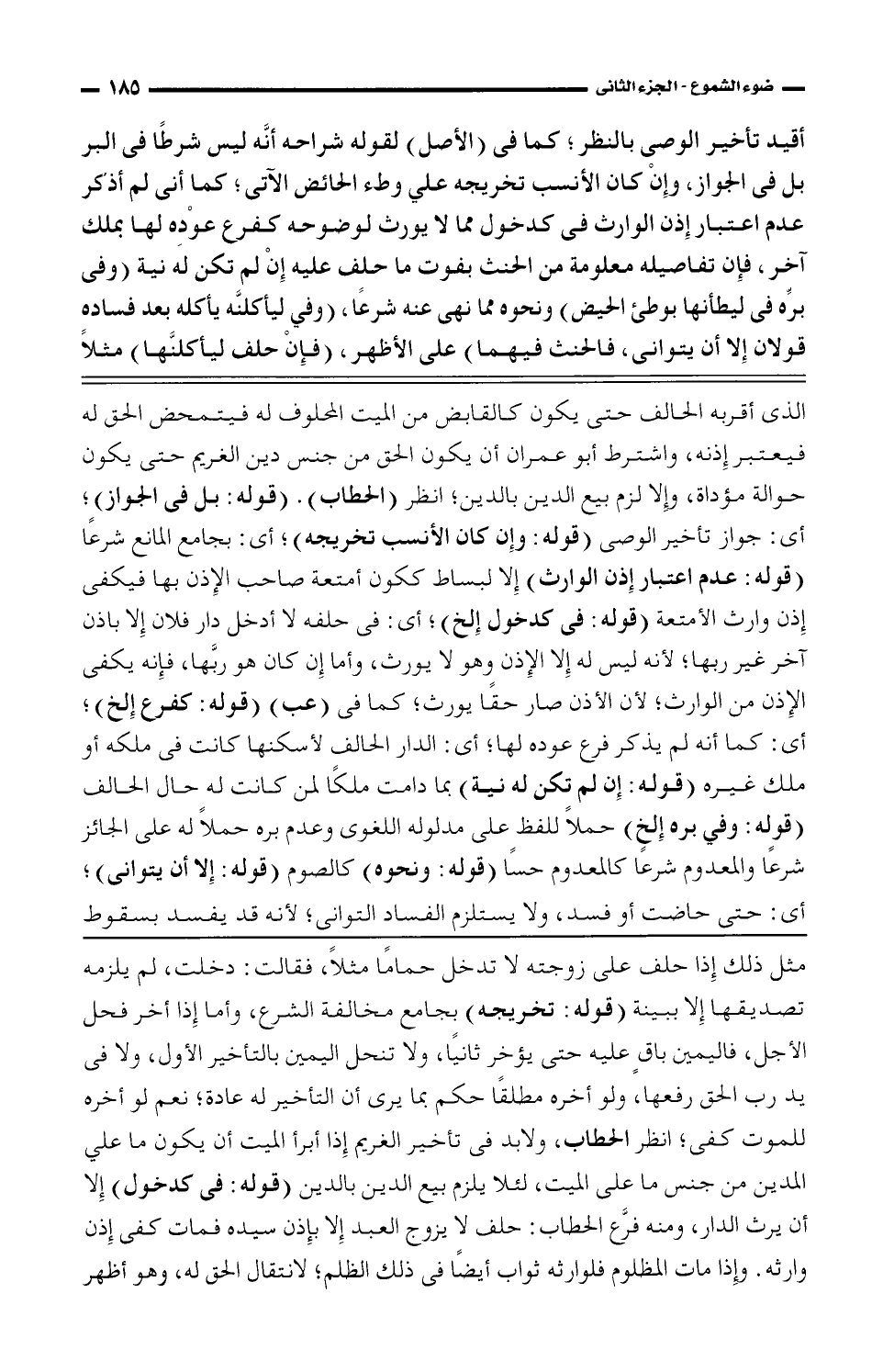 الذي أقربه الحالف حتى يكون كالقابض من الميت المحلوف له فيتمحض الحق له فيعتبر إذنه، واشترط أبى عمران أن يكون الحق من جنس دين الغريم حتى يكون حوالة مؤداه، وإلا لزم بيع الدين بالدين؛ انظر (الحطاب). (قوله: بل في الجواز)؛ أي: جواز تأخير الوصي (قوله: وإن كان الأنسب تخريجه)؛ أي: بجامع المانع شرعًا (قوله: عدم اعتبار إذن الورث) إلا لبساط ككون أمتعة صاحب الإذن بها فيكفي إذن وارث الأمتعة (قوله: في كدخول إلخ)؛ أي: في حلفه لا أدخل دار فلان إلا بإذن آخر غير ربها؛ لأنه ليس له إلا الإذن وهو لا يورث، وأما إن كان هو ربها، فإنه يكفي الإذن من الوارث؛ لأن الأذن صار حقًا يورث؛ كما في (عب) (قوله: كفرع إلخ)؛ أي: كما أنه لم يذكر فرع عوده لها؛ أي: الدار الحالف لأسكانها كانت في ملكه أو ملك غيره (قوله: إن لم تكن له نية) بما دامت ملكًا لمن كانت له حال الحالف (قوله: وفي بره إلخ) حملًا للفظ على مدلوله اللغوي وعدم بره حملًا على الجائز شرعًا والمعدوم شرعًا كالمعدوم- صبيًا (قوله: ونحو) كالصوم (قوله: إلا أن يتوانى)؛ أي: حتى حاضت أو فسد، ولا يستلزم الفساد التواني؛ لأنه قد يفسد بسقوط