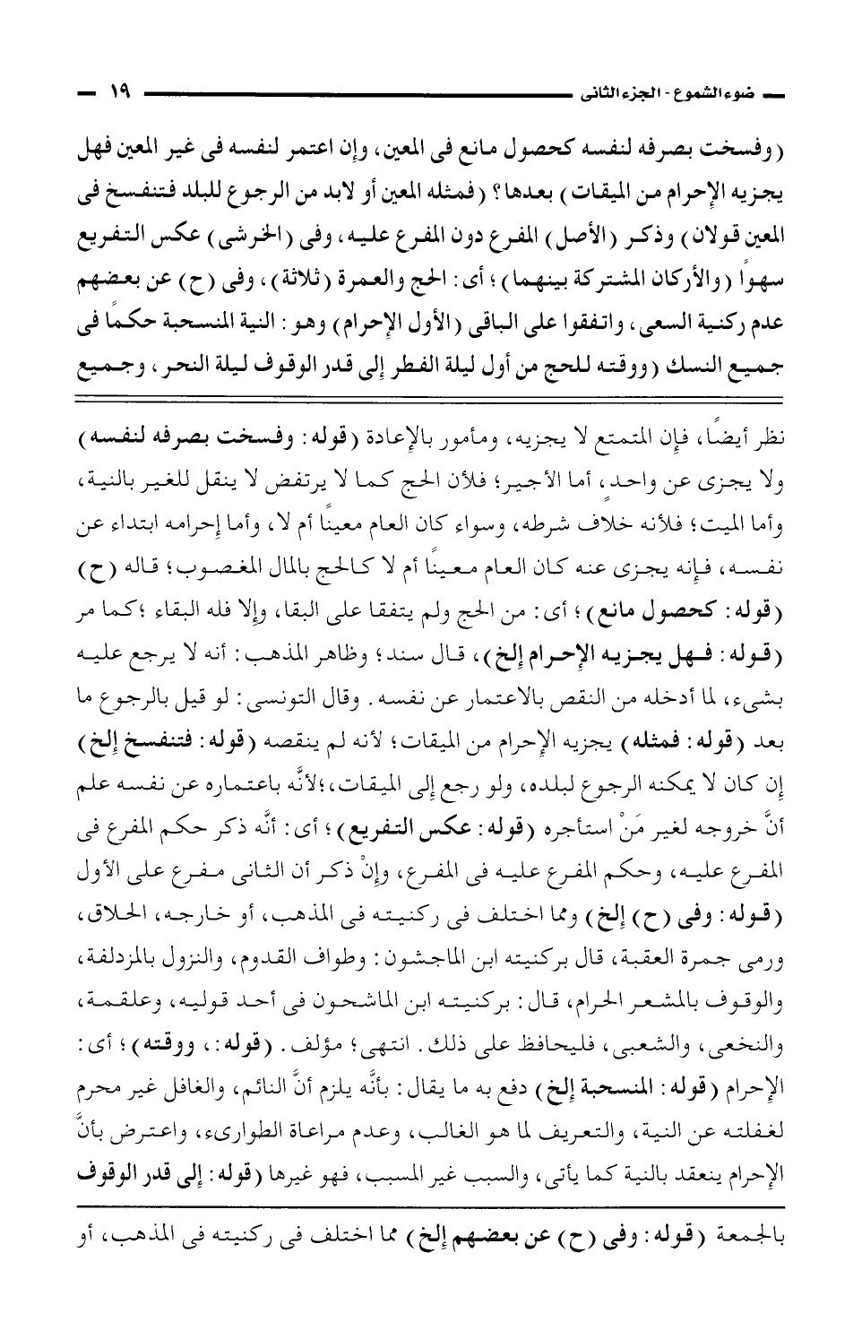 (وفسخت بصرفه لنفسه كحصول مانع فى المعين، وغن اعتمر لنفسه فى غير المعين فهل يجزيه الإحرام من الميقات) بعدها؟ (فمثله المعين أو لابد من الرجوع للبلد فتنفسخ فى المعين قولان) وذكر (الأصل) المفرع دون المفرع عليه، وفى (الخرشى) عكس التفريع سهواً (والأركان المشتركة بينهما)؛ أى: الحج والعمرة (ثلاثة)، وفى (ح) عن بعضهم عدم ركنية السعى، واتفقوا على الباقى (الأول الإحرام) وهو: النية المنسحبة حكمًا فى جميع النسك (ووقته للحج من أول ليلة الفطر إلى قدر الوقوف ليلة النحر، وجميع