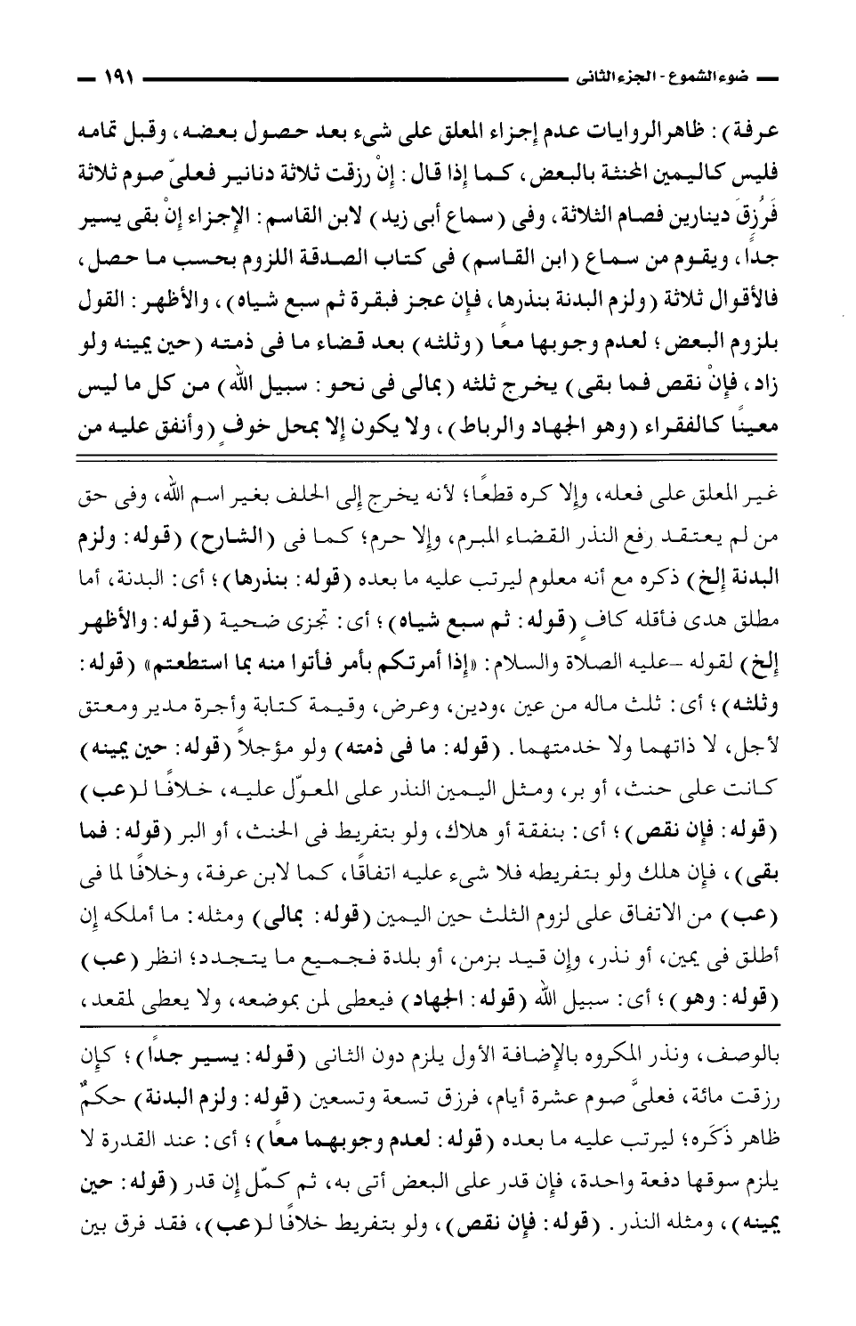 عرفة): ظاهر الروايات عدم إجزاء المعلق على شيء بعد حصول بعضه، وقبل تمامه فليس كاليمين المحنثة بالبعض، كما إذا قال: إن رزقت ثلاثة دنانير فعلي صوم ثلاثة فرزق دينارين فصام الثلاثة، وفي (سماع أبي زيد) لابن القاسم: الإجزاء إن بقى يسير جدًا، ويقوم من سماع (ابن القاسم) في كتاب الصدقة اللزوم بحسب ما حصل، فالأقوال ثلاثة (ولزم البدنة بنذرها، فإن عجز فبقرة ثم سبع شياه)، والأظهر: القول بلزوم البعض؛ لعدم وحوبها معًا (وثلثه) بعد قضاء ما في ذمته (حين يمينه ولو زاد، فإن نقص فما بقى) يخرج ثلثه (بمالي في نحو: سبيل الله) من كل ما ليس معينًا كالفقراء (وهو الجهاد والرباط)، ولا يكون إلا بمحل خوف (وأنفق عليه من